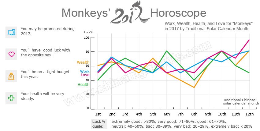 In 2017, Monkeys will have quite good luck. But since 2016 is the Monkeys‘ unlucky year, they will still need to be careful, until all the bad luck is gone.