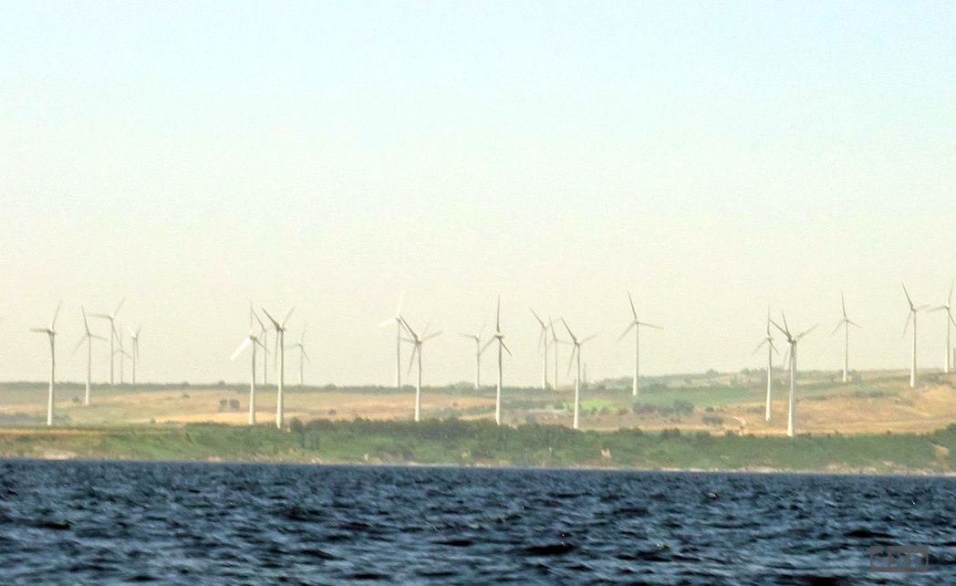 Ich bereite den Anker vor. Fahre langsam in das Eck. 8m, 6m, 5m. Im klaren Wasser ist gut der Sandboden zu sehen. Im Sand hält der Anker gut. Steine oder Seegras ist eher nicht so gut. Noch mal im Kreis gefahren und geschaut, dann aufstoppen, den Anker raus und rückwärts bis sich die 20m Ankerleine spannen und sich der Anker in den Boden gräbt. Erst mal Pause. Wind ist hier keiner, obwohl sich die Windräder an Land flott drehen. Aber eine Dünung hat es.
