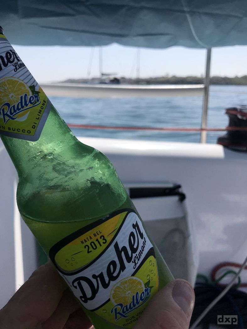 Abends wird die Dünung kräftiger und ein Wind von der Seite kommt auf. In der Nacht sollte der Wind ja drehen und eher vom Land her kommen. Kurz vor Dunkel ziehe ich meinen Heckanker wieder hoch, so dass die Rapide sich in den zu erwartenden Wind drehen kann in der Nacht. Aber es kommt kein Wind und alles schaukelt wie irre. Schlafen geht so nicht. Damit das mit dem Heckanker ordentlich funktionier, muß der auch richtig gesetzt werden. Also noch mal alles neu. Hinten gebe ich alle 30m Leine. Vorne ziehe ich den Anker hoch. Fahre dann langsam vorwärts, bis sich die Heckleine spannt und sich der Anker eingräbt. Vorne anker wieder raus und 20m Leine geben. Langsam rückwärts, die Heckleine dabei einholen, bis sich der vordere Anker fest in den Sand zieht. So. Vorne 20m, hinten 10m Leine. Bei 5m Wassertiefe sollte das bei einer Windstillen Nacht halten.