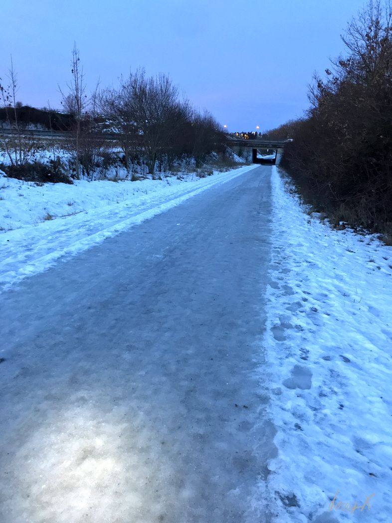 Bitter kalt ist es heute Morgen. Die letzten Tage hatte es getaut, die Straßen sind eisig. Vorsichtig radl ich in die Arbeit. Kurz vor Ziel geht es leicht abwärts, unter der Autobahn durch. Ein Junge Frau warnt mich schon einige Meter vorher, dass es eisig ist.