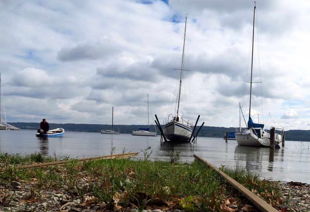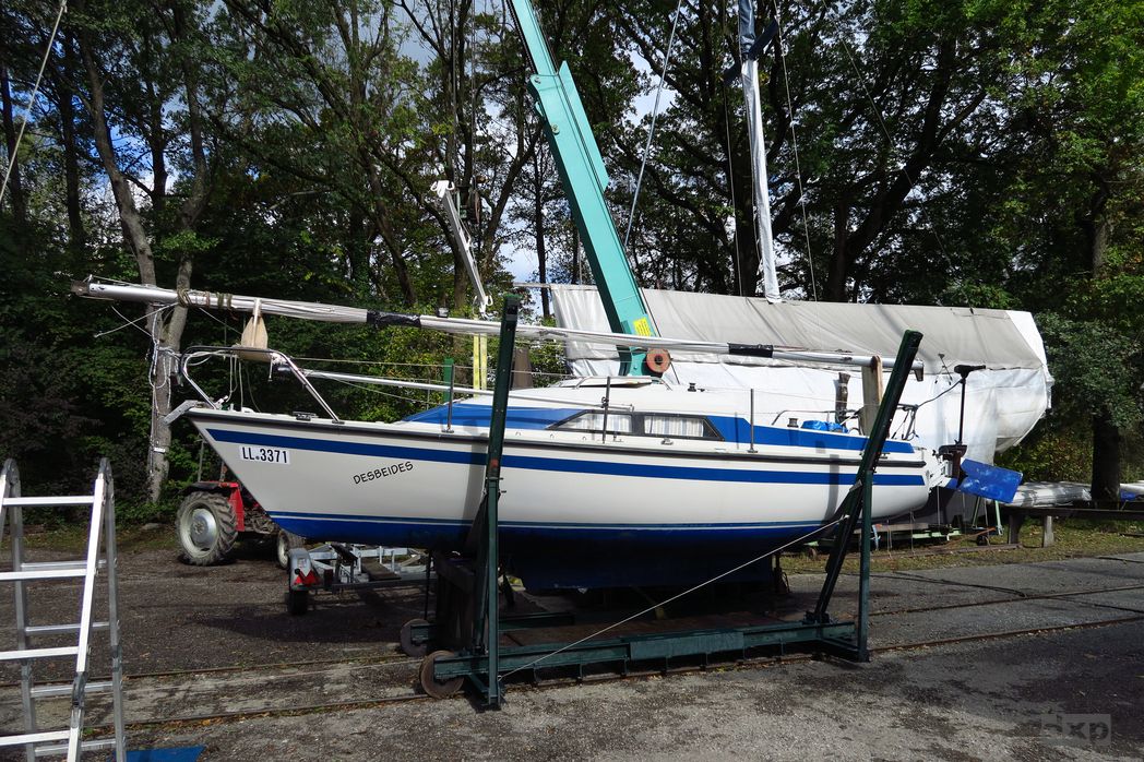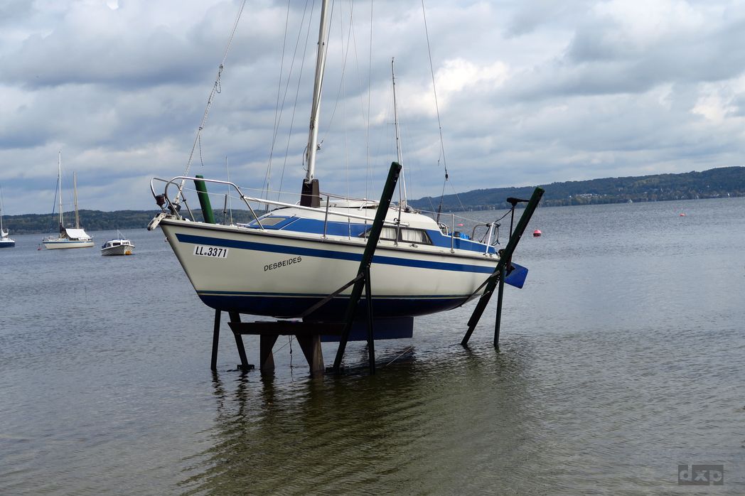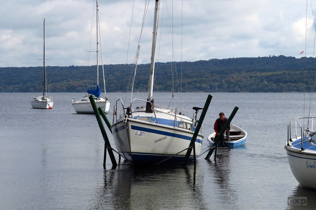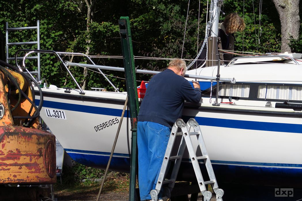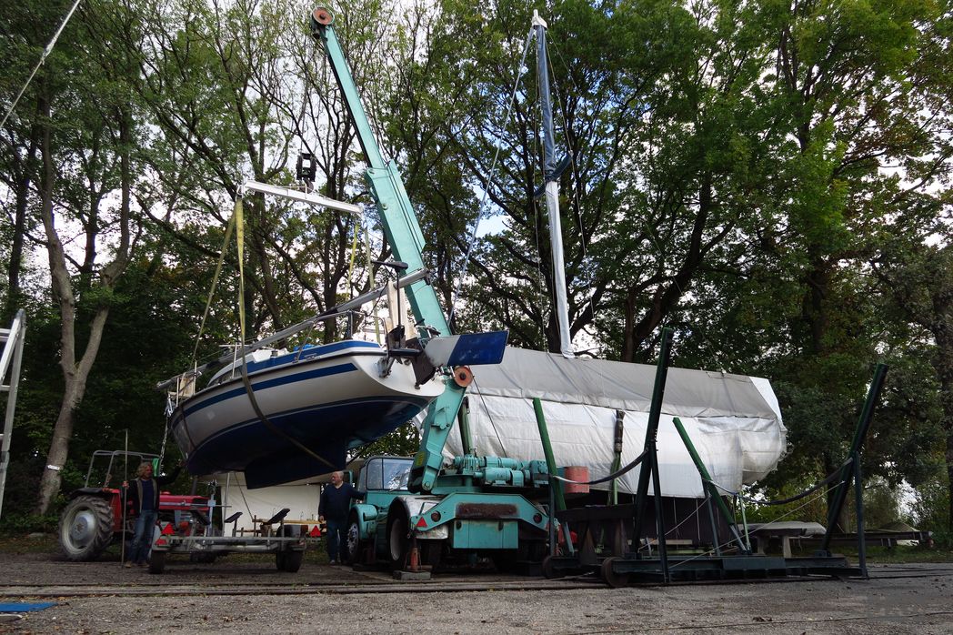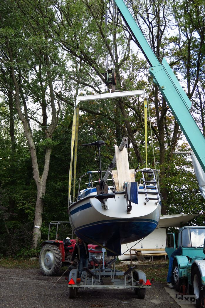 Ende Saison. Unsere“Petite Fleur“ kommt aus dem Wasser für den Winterschlaf. Über Schienen wird sie auf einem Schlitten aus dem Wasser gezogen. Dann abgestrahlt und auf den Anhänger verladen. Nun ist sie im Winterschlaf bis zum nächsten Mai.
