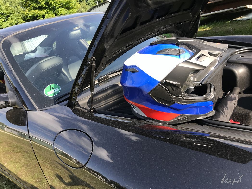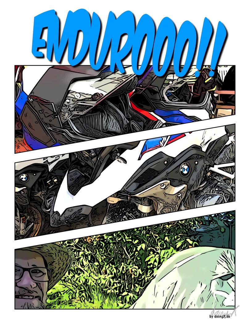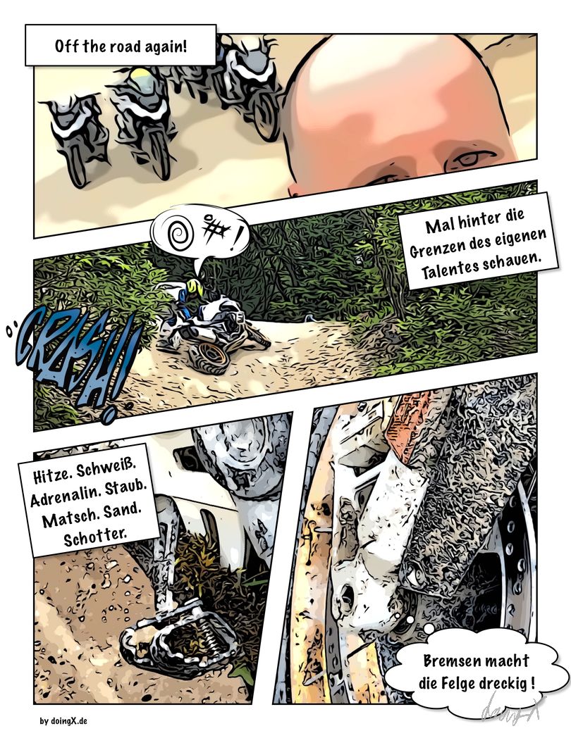 Die Sonne brennt mit 28°C. Tropisches Klima im Enduro-Anzug. Nur noch etwas Blut im Adrenalinkreislauf. Gerade bin ich mit dem Moped, nach einer zu schnell hoch gefahrenen Rampe, im Erdwall gegenüber eingeschlagen. Gasstoß in der Kompression, Körper konstant in der Senkrechten. Alles richtig, Lehrbuch. Nur halt etwas zu schnell. Ich habe noch probiert zu bremsen. Allerdings lässt die Bremswirkung deutlich nach, wenn das Moped in der Luft ist. Hat also nicht viel geholfen, der Erdwall kam recht schnell näher.