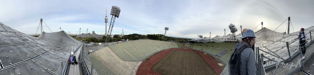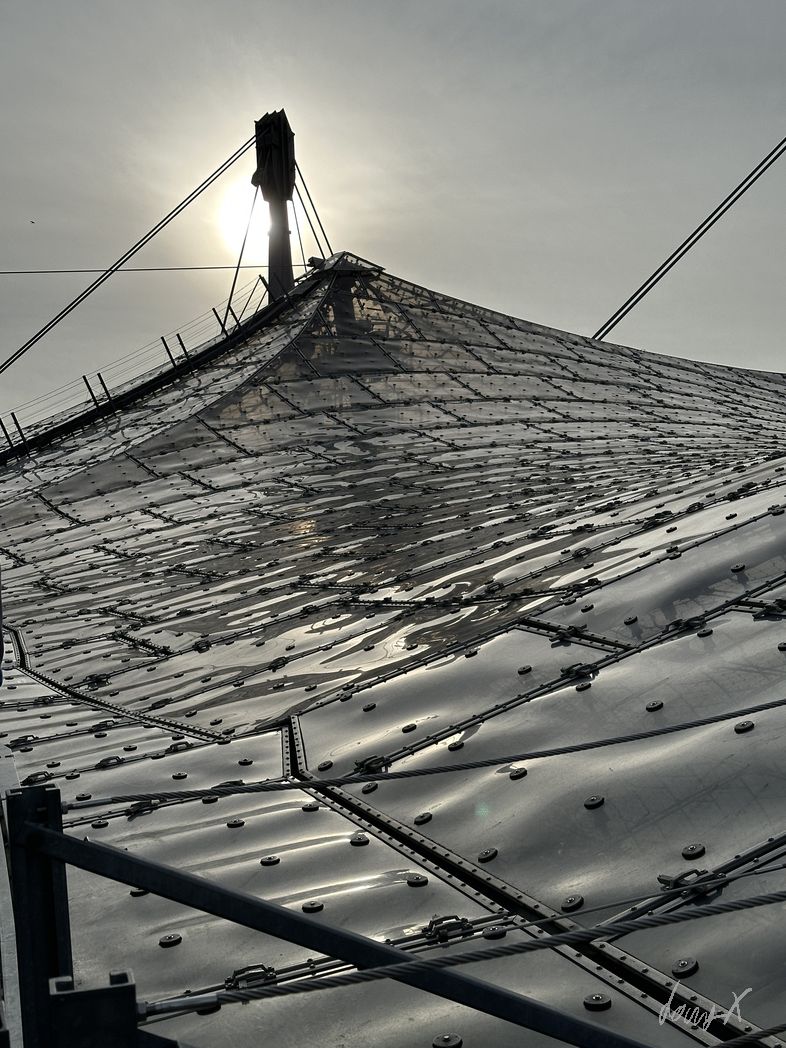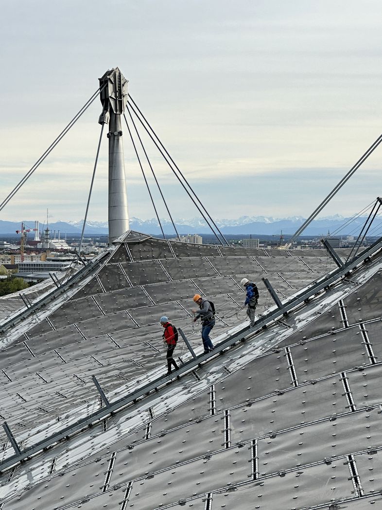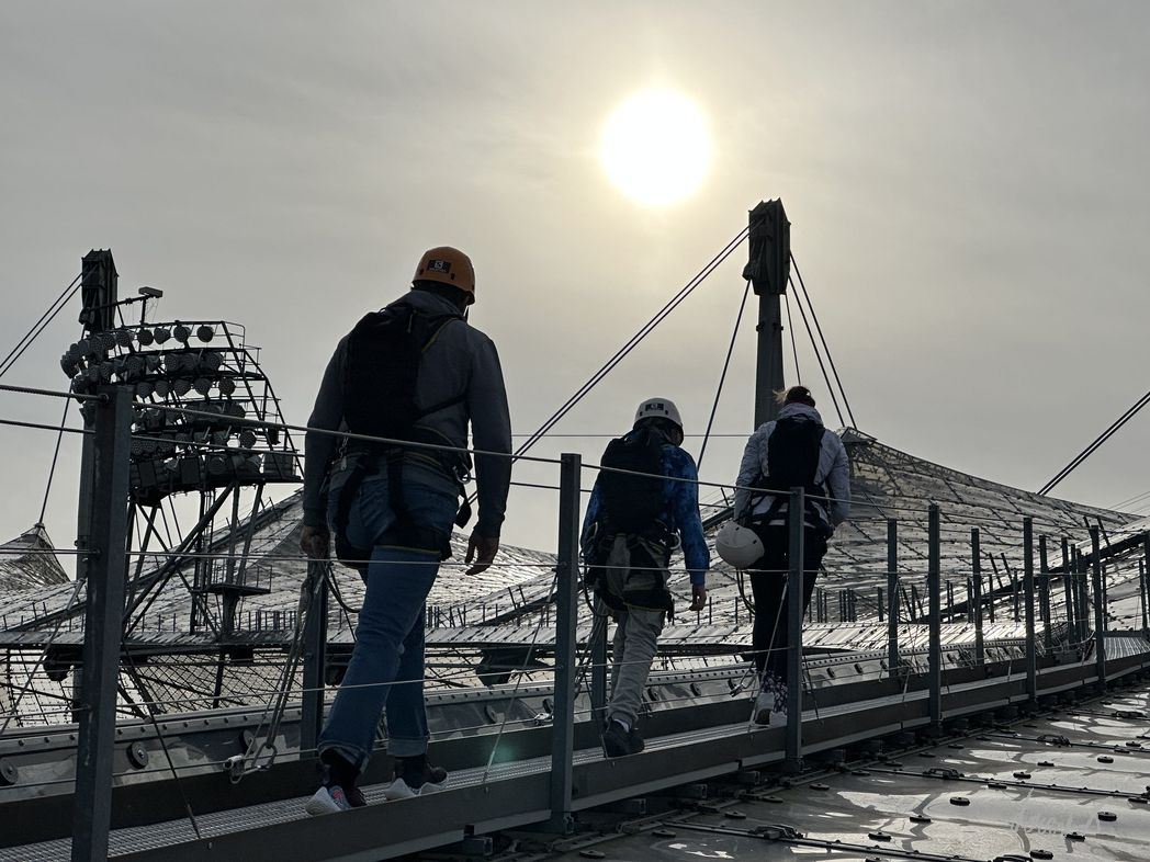 Einweisung, Klettergurte, Seilrolle, … Und los kann’s gehen. Auf einem schmalen Steg über das Olympia Stadion Dach. Den Karbiner, eingehängt in ein Stahlseil, ziehen wir hinterher. Der Guide erzählt zur Geschichte und Entstehung des Zeltdaches. Weiter klettern wir bis ganz hinauf, belohnt mit der Aussicht über München. Und dann der krönende Abschluß. Zssssssss …. Flying Fox!