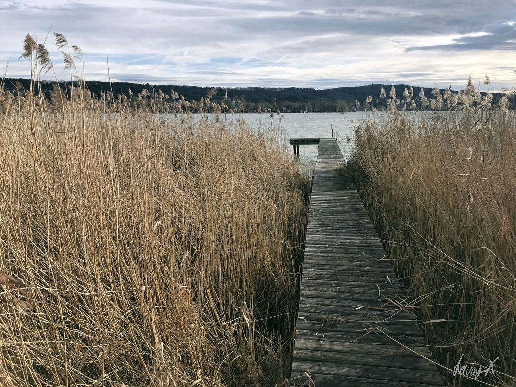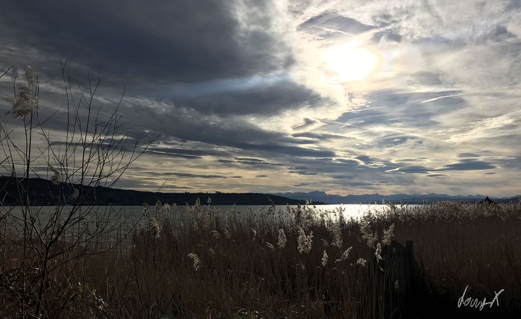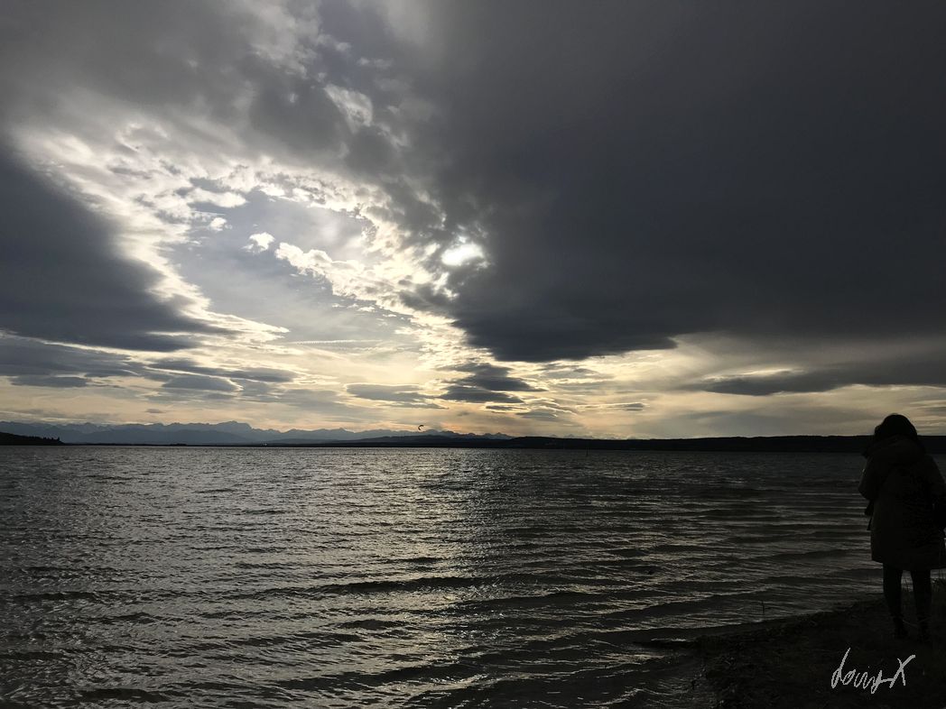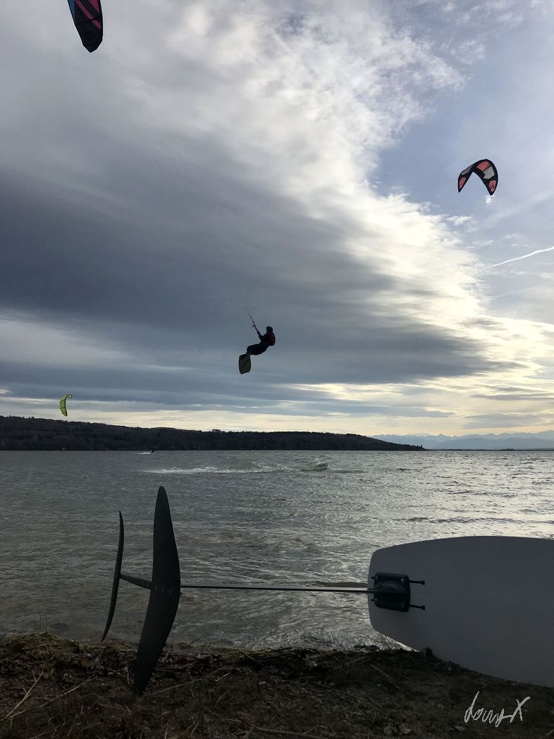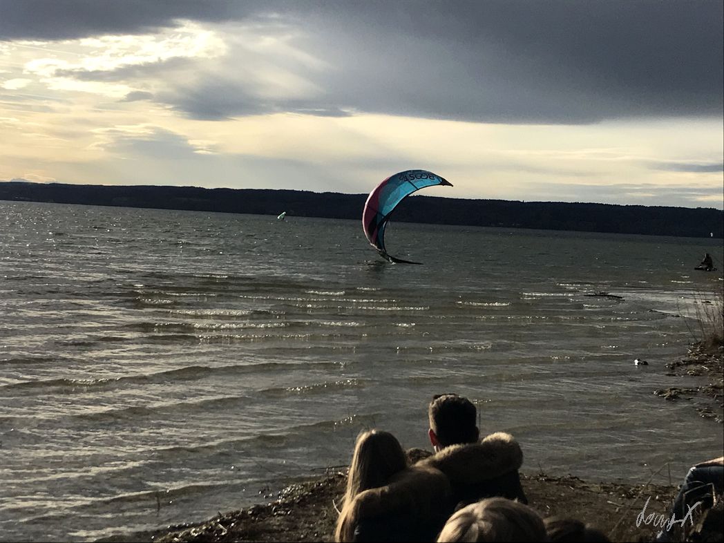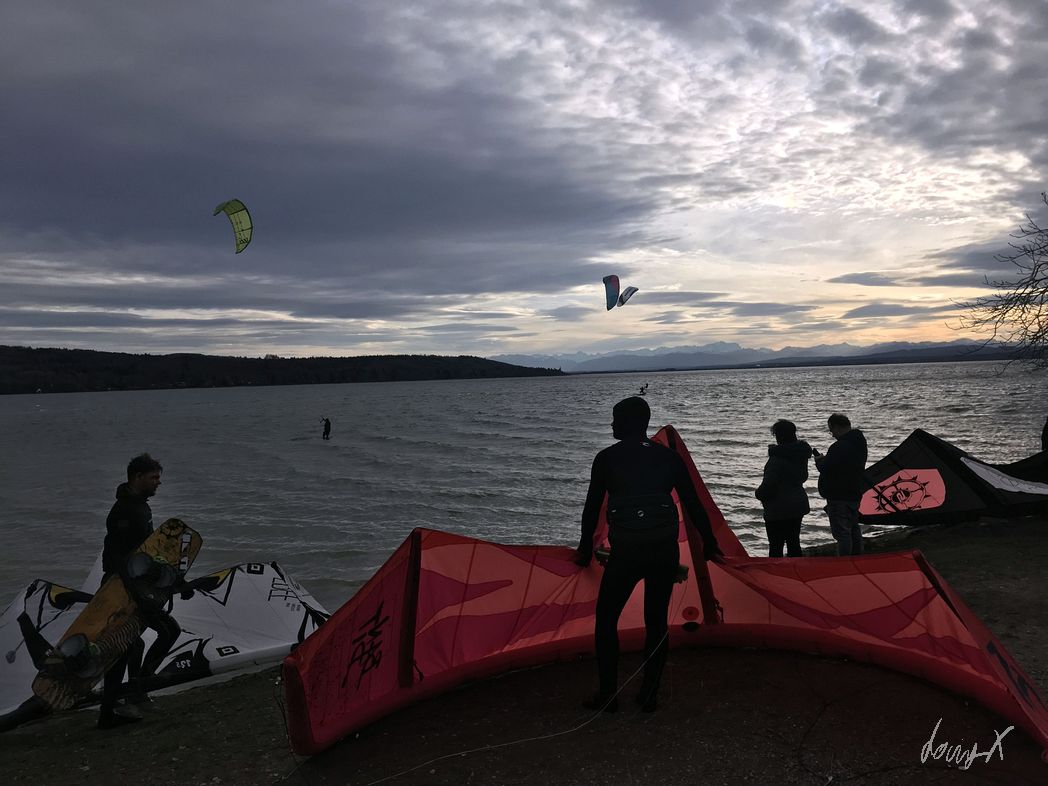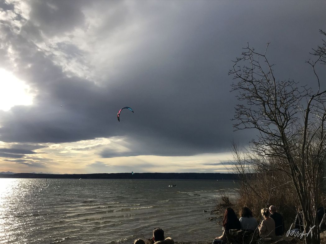 Die Sonne steht tief. Die Berge zeichnen sich am Horizont, hinter dem See, als Siluetten gegen den hellen Himmel ab. Das Tief zieht von westen über den See, bringt dunklen Wolken mit. Einige Kiter haben sich in der Herrschinger bucht zum Neujahrskiten getroffen. Ein perfekter Tag, für die Kiter und die Zuschauer.