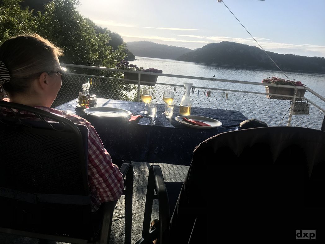 Bei unserem Anleger liegt nur ein weiteres Boot. Flott hin, Fender raus und rückwärts eingeparkt. Passt. Die Restaurant Besitzer vom „Tatinica Dalmatinac“ haben nett geholfen und bringen uns sogar noch einen Sundowner (irgendein selbstgemachtes Kreuter dingens) vorbei. Excellent. 400 Kuna mit Getränken, und der Liegeplatz ist dabei. Ein Schnapp.