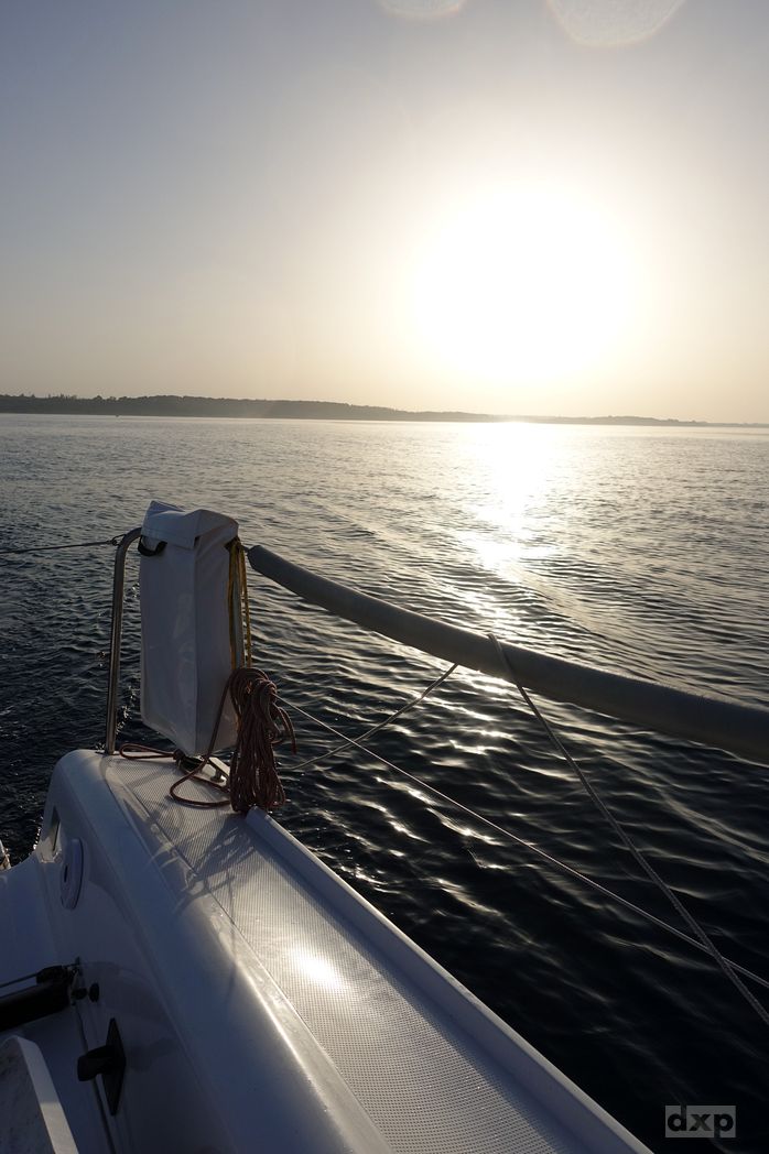 Die letzten vier Stunden dann nur mit Motor. Kein Windhauch mehr. Dafür Wellen die von hinten schieben. Sehr unangenehm, da die Rapide hin und her rollt.