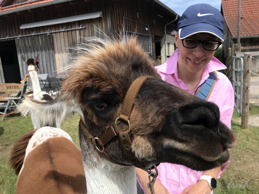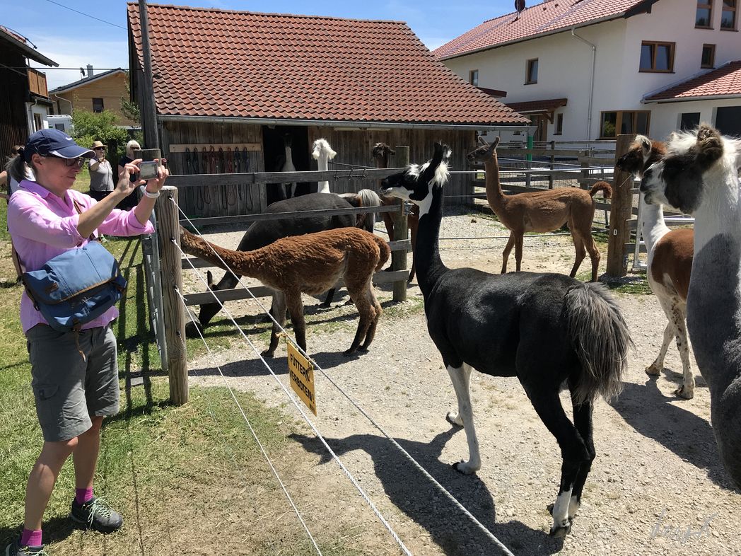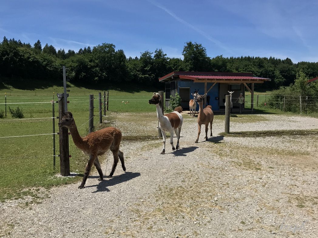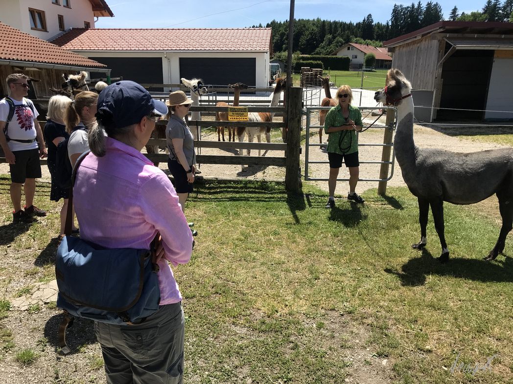 Lama Tour in Bayern. Wer kommt denn auf so eine Idee? Die Lamas beäugen uns neugierig. Kurz nur, dann lieber weiter essen oder in der Sonne faulenzen. Unser Guide erklärt uns was zu den Lamas, bevor es los geht.