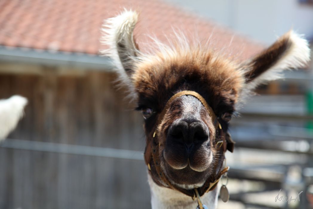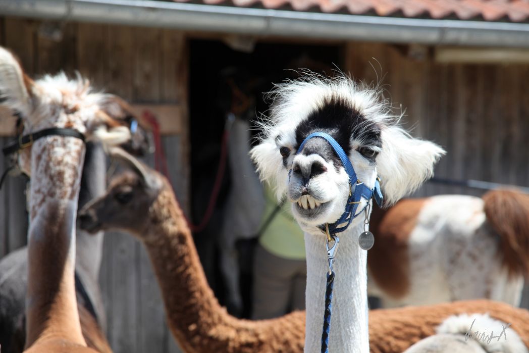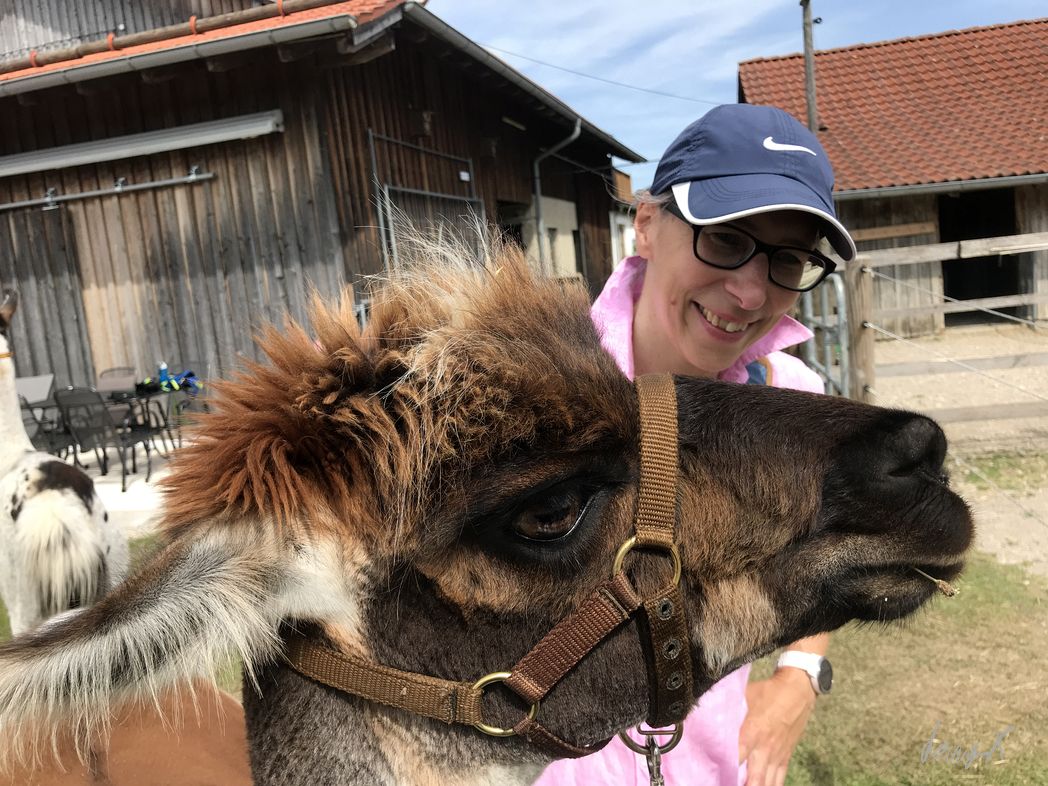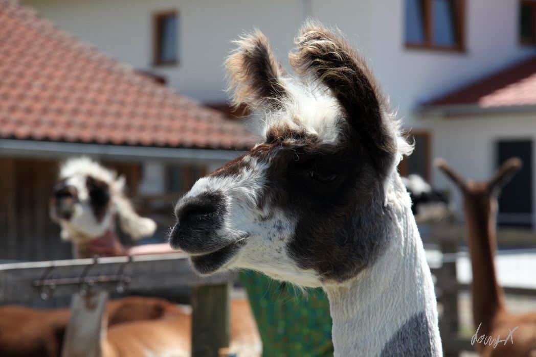 Lama Tour in Bayern. Wer kommt denn auf so eine Idee? Die Lamas beäugen uns neugierig. Kurz nur, dann lieber weiter essen oder in der Sonne faulenzen. Unser Guide erklärt uns was zu den Lamas, bevor es los geht.