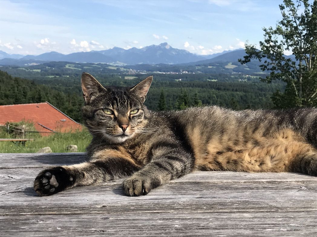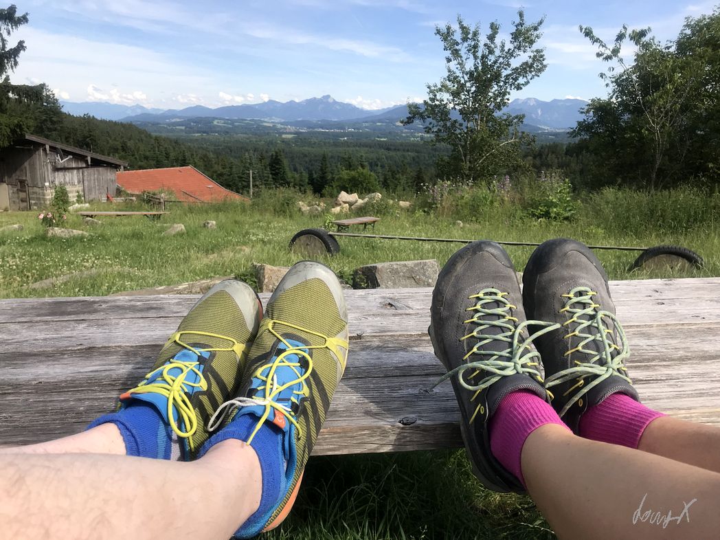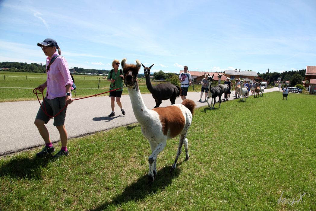 Sonnenschein, 27 Grad, blauer Himmel und grüne Wiesen. Bilderbuch Panorama in den bayrischen Voralpen. Wir sind auf dem Weg zum Lamaland Loher für eine Lama Wanderung.