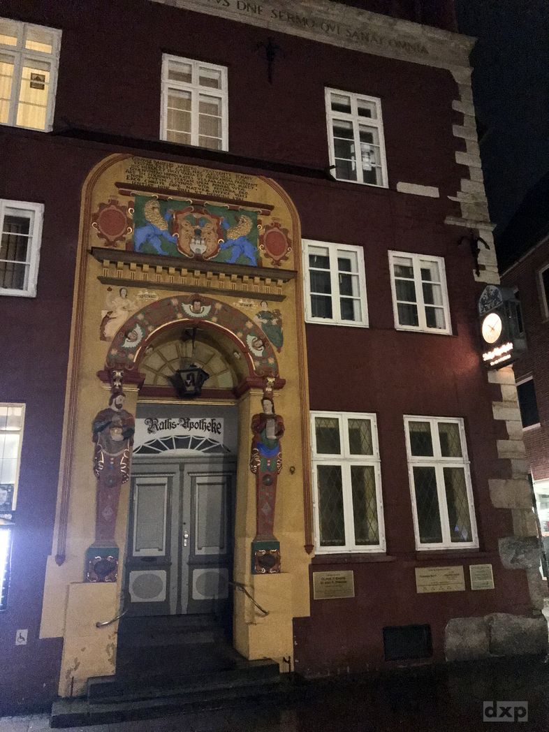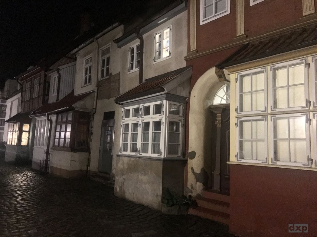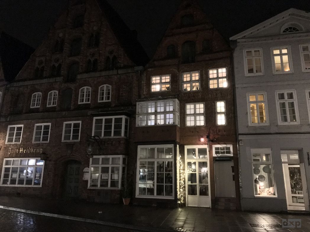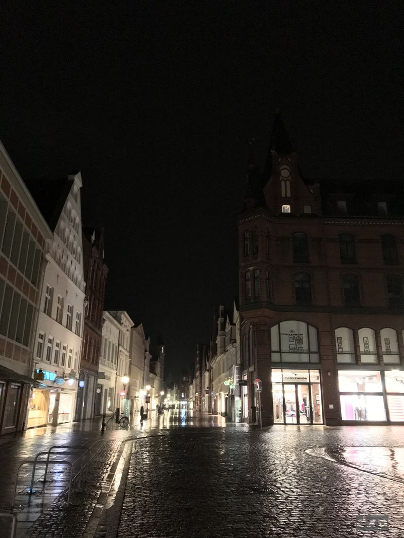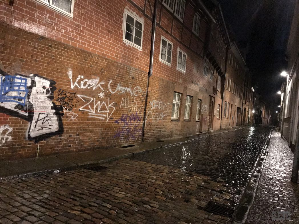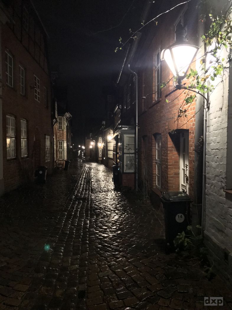 Mit dem Auto vom Hamburger Flughafen brauche ich wegen Wetter und Stau über eine Stunde. Sturm, regen und kalt. Brrr. Dennoch raffe ich mich um 22:00 noch zu einem Spaziergang auf. Kaum Menschen auf der Straße. Ein Zeitreise in’s 14te Jahrhundert. Kleine Sträßchen, alte Gemäuer, Wind der um die Ecken pfeift.