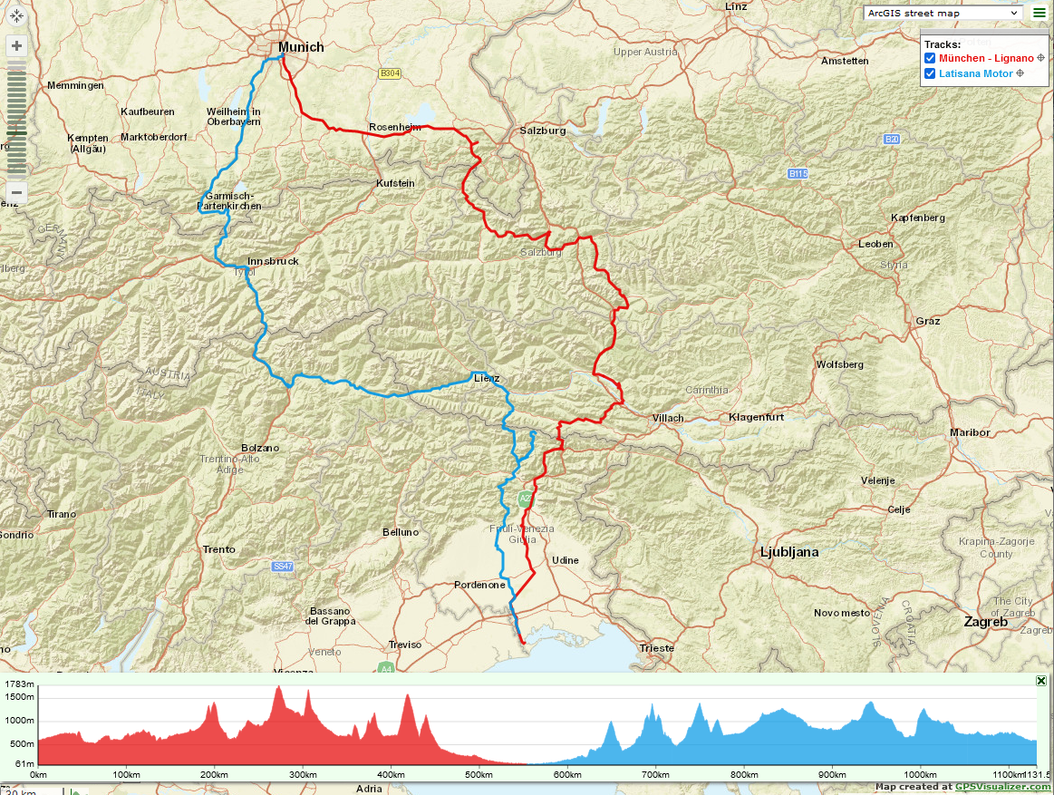 Von München über Berchdesgaden bis Flachau im Regen. Bitter kalt und patschnass. Der Cheesburger bei MacDo gibt schnelle Energie. Weiter über Obertauern, Hergamoor und den wünderschönen Passo di Pramollo und nach Lignano. 552 km in 9.5 Stunden und über 8 Pässe. Der Rücken schmerzt und die Hände haben Krämpfe. Die Pizza und ein Bier richten das wieder.