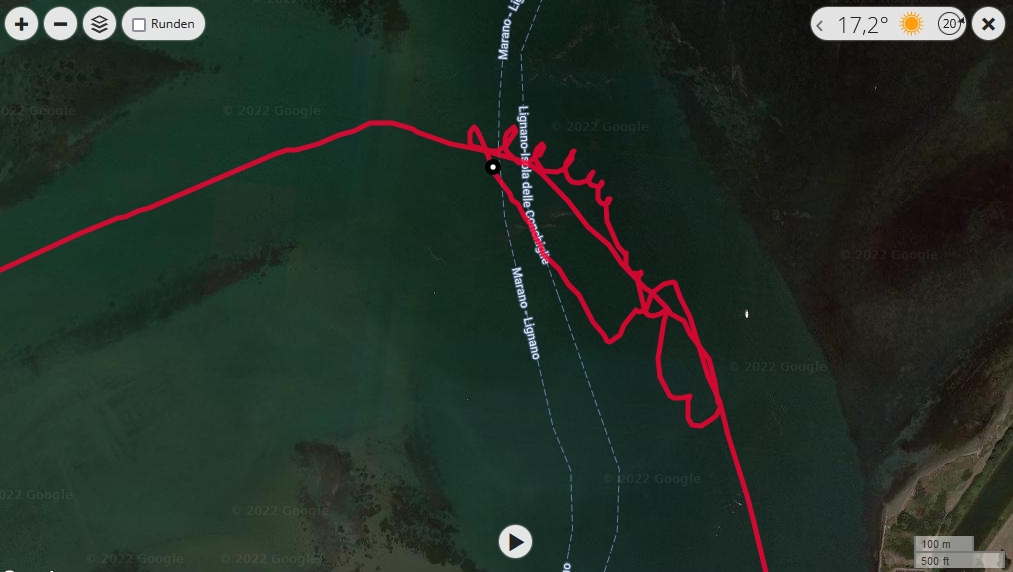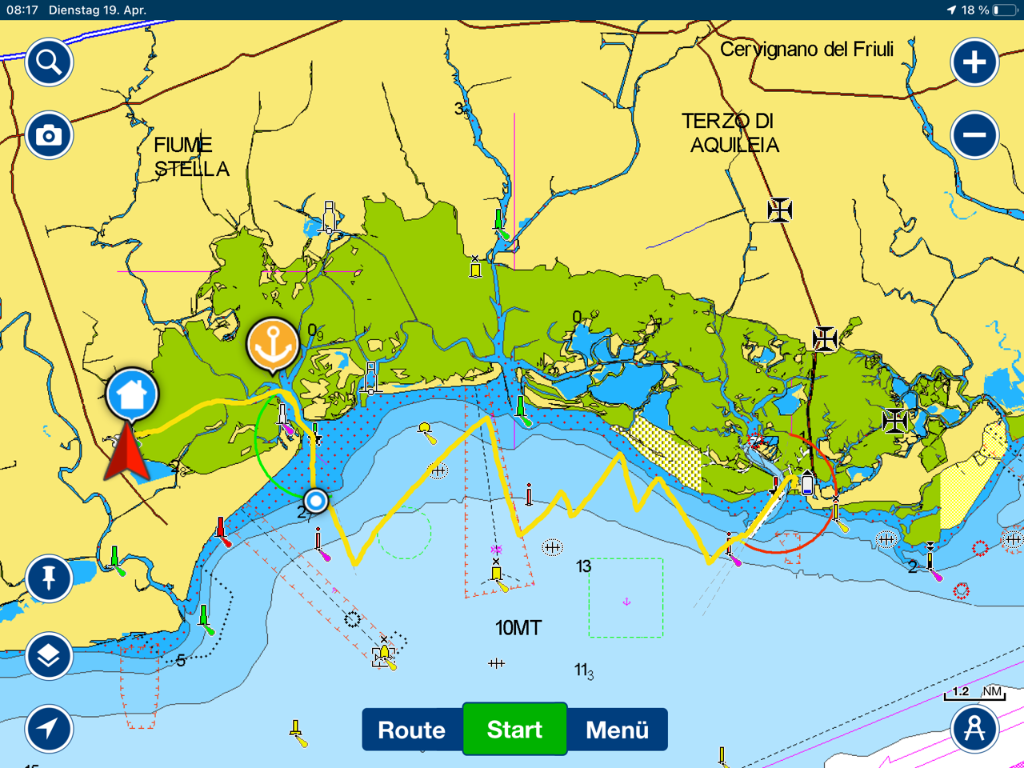 Für heute dann halt ohne Autopilot. Das zweite Reff im Groß und mit kleiner Fock machen wir uns auf nach Grado. Der Wind hat ordentlich Wellen aufgebaut. Tapfer kämpft sich die Fleur gegen den Wind. Und der Wind ist kühl. Zusammen mit der aufegwirbelten Gischt wird uns auch schnell kalt. Ich müß steuern und die Navigation im Auge behalten. Beatrice bediehnt die Segel. Kein einfacher Job bei dem Wind und den Wellen. Die erste Tour des Jahres hatten wir uns deutlich entspannter vorgestellt.