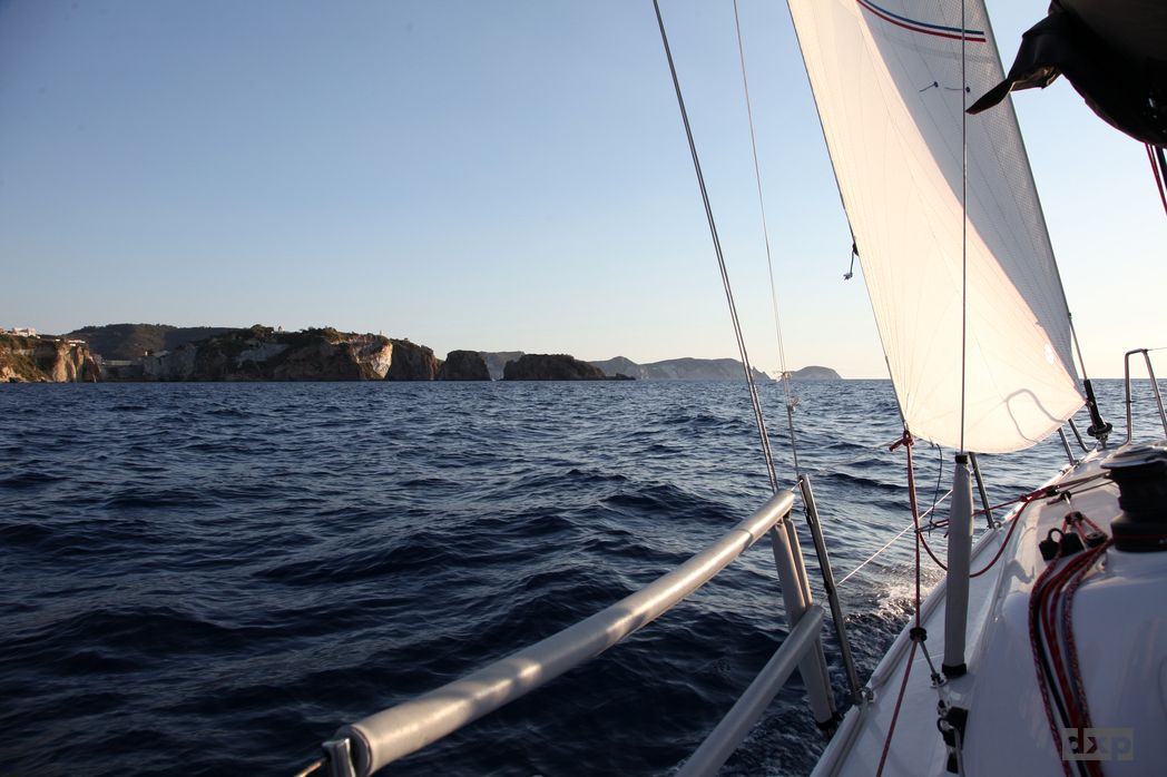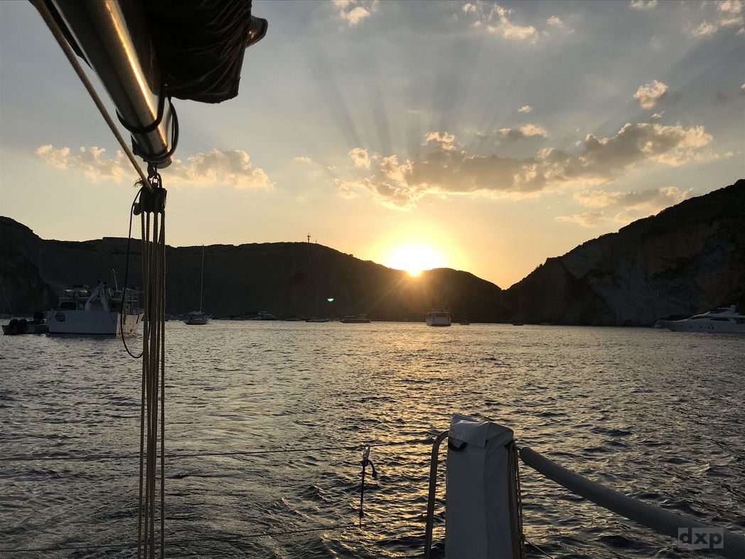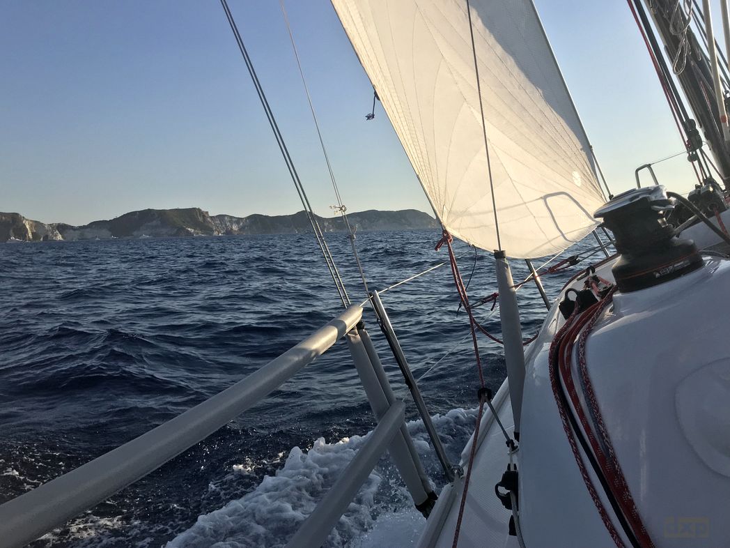 So weit so gut. Der Wind schiebt leicht von hinten, gut um den Gennaker hoch zu machen. Das ist ein bisschen Arbeit, dafür geht’s dann flotter weiter. Wer schnell segeln will, muß arbeiten! Blöd, dass genau in dem Moment, als ich alles fertig hatte, durchgeschwitzt bin, dreht dieser blöde Wind um 90 oder so Grad und kommt nun von vorn. Nix mit Gennaker. Alles wieder abbauen und mit dichten Segeln gegen den Wind. Nach ein, zwei Stunden ist auch der Wind weg und das Meer spiegel glatt. Leider ist nicht mehr viel Benzin da, um die 25 Meilen nach Nettuno zu kommen. Was nun? Dahintreiben macht nicht wirklich Spass. Seekarte studieren. Da ist ein netter Hafen in 15 Meilen, weiter östlich. Dort hat es eine Tankstelle. Übernachten sollte ich auch dort, da es doch schon spät geworden ist.