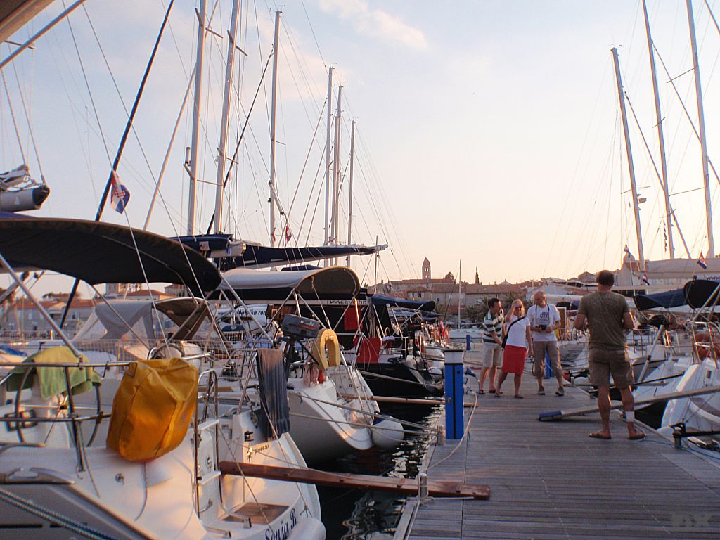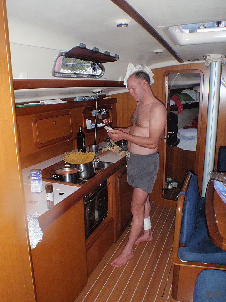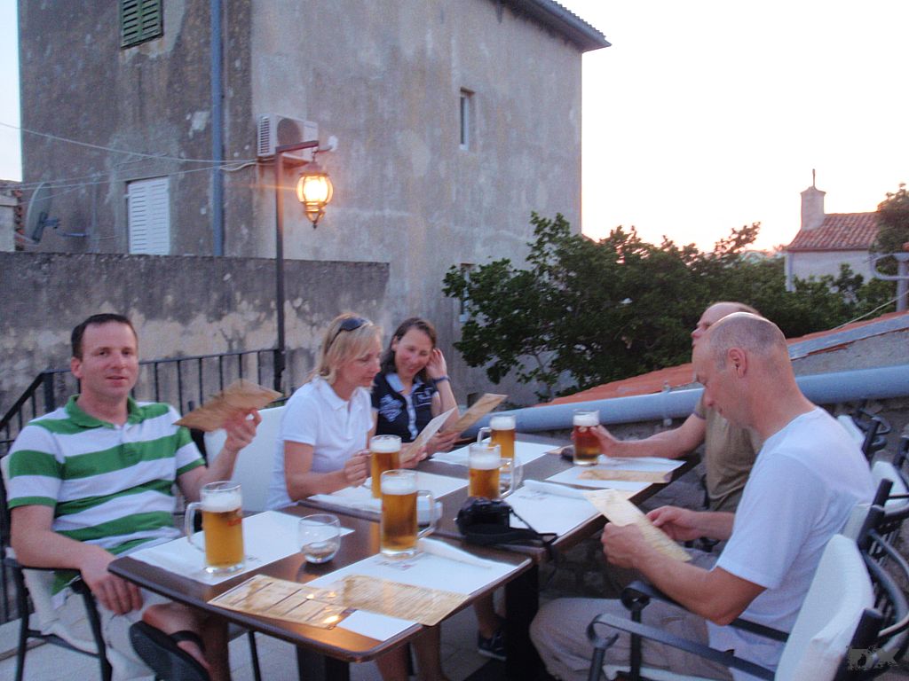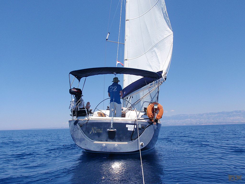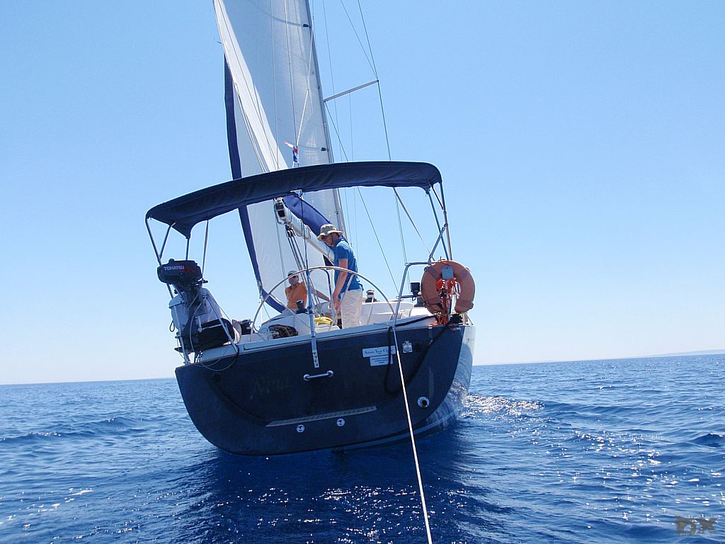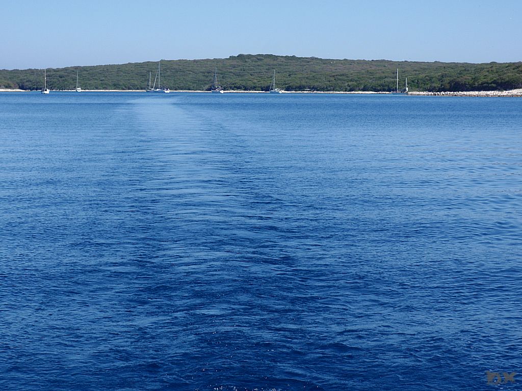 Der lange Schlag nach Rab steht an. Quer durch die Kvarner Bucht. Wenig Wind. Mit 2-3 Knoten Fahrt dümpeln wir dahin. Die Hitze ist drückend. Die Schattenplätzchen rar. Vor der Einfahrt in der Hafen noch eine Runde schwimmen. Ingo verletzt sich leider ordentlich am Schienbein, wird später am Tag in Rab mit vier Stichen genäht. Aber was solls. Der Körper muß das ab können. Im Hafen steht die Luft. An Board ist es nicht aus zu halten. Den Nachmittag verbringen wir in einer schattigen Lounge bei einem kühlen Bierchen. Lifes Easy. Abends excellente kroatische Tapas. Tolle Idee. So kann man mehrere kleine Leckereien probieren. Anchovis auf Polenta, gegrillte Kalamari, Garnelen … um Euch den Mund wässrig zu machen. Nachts ist kaum an schlafen zu denken. Die östereichischen Nachbarn feiern bis zum Sonnenaufgang ohne Rücksicht auf Verluste. Nur weg hier. Ankern ist Klasse, da kann man sich die Nachbarn aussuchen.