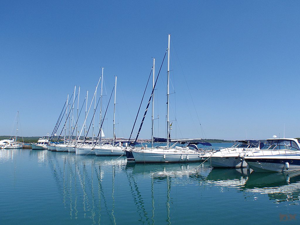 Der Wind steht gut für unseren letzten Segeltag. 12-15 Knoten aus Süd-Ost. Bora. In flotter Fahrt kreuzen wir erst etwas auf, um dann in fast einem Rutsch zurück nach Pomer zu kommen. Die Einfahrt nach Pomer war dann noch mal spannedn. Kleine Inselchen sind zu durchfahren, 1-2 Meter Wasser unter dem Kiel bei 7 Knoten Fahrt. Die Bucht ist belebt und einige andere Yachten sind unterwegs. Fehler sind nicht erlaubt. Unter vollen Segeln biegen wir in den Einfahrtskanal von Pomer ein. Noch ein Böe, das Schiff neigt sich zu Seite. Spektakulär. Leute beobachten uns. Souverän in die Bucht, Aufschießer, die Segel fallen in wenigen Sekunden. Eine Profi-Crew ist am Werk! Gemütlich in den Hafen und sauber rückwärts eingeparkt.