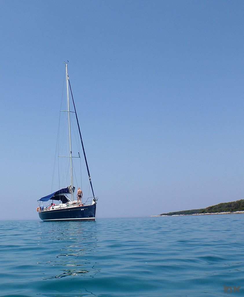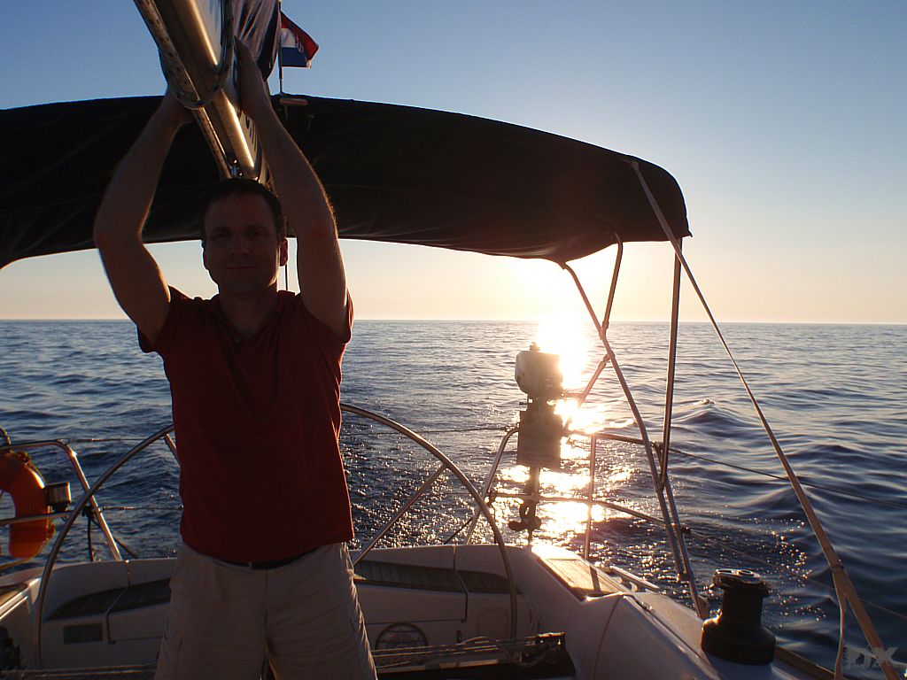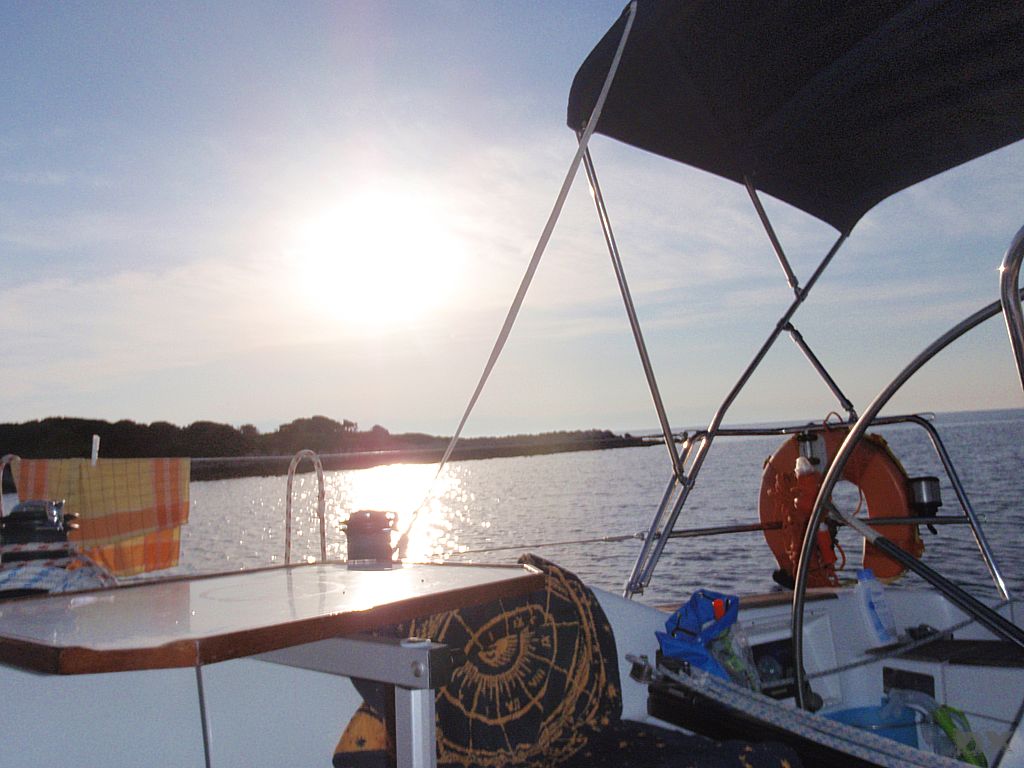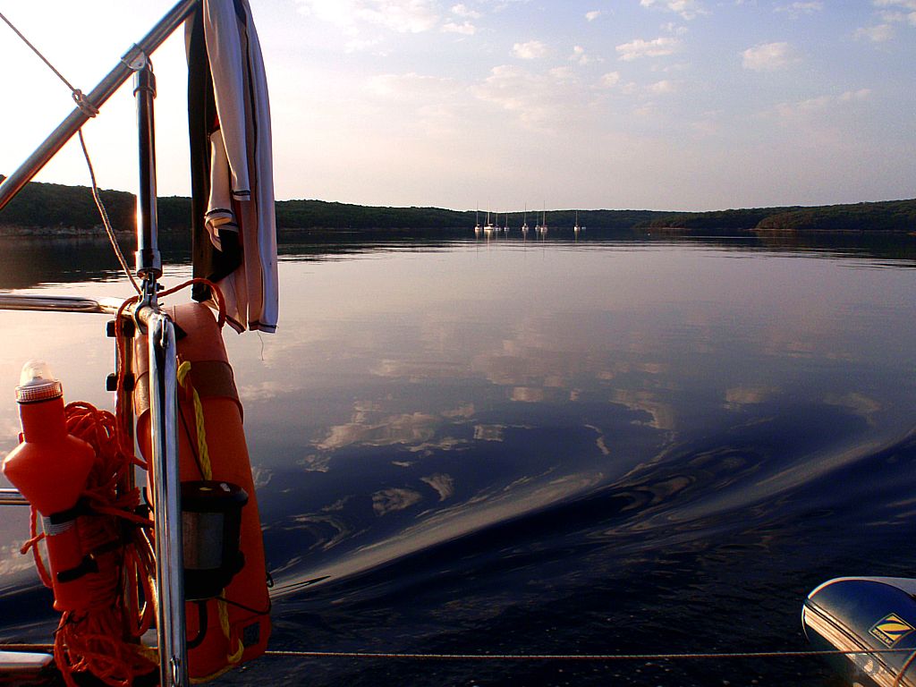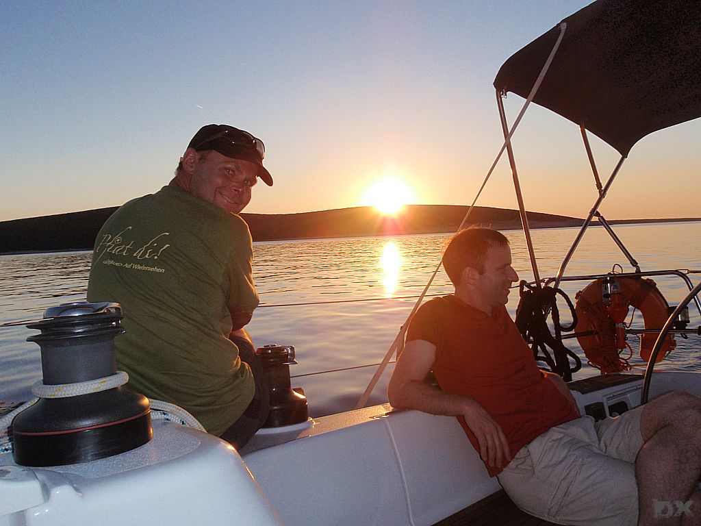 Die Temperatur in Kroatien war erst mal erschlagend. Knapp 35°C. Kaum ein Windhauch. Schnell auf’s Boot, ablegen und los. Ablegen, nun ja. Der Motor lief zwar, aber ohne Gang eingelegt. Mit dem Ablegemanöver haben wir erst mal Aufsehen erregt. Ebbe war auch noch, so dass wir in der Hafenausfahrt mit 0 cam unter dem Kiel rausgerutscht sind. Ein frisches, kühles Bier tut da dann auch gut. Im freien Wasser den Spinnaker gesetzt und mit 5 Knoten Fahrt einen langen Schlag von 25 sm nach Unije, einer kleinen Insel in der Kvarner Bucht. Wir liegen alleine vor Anker. Windstille. Schwimmen. Sonnenuntergang. Herrlich.