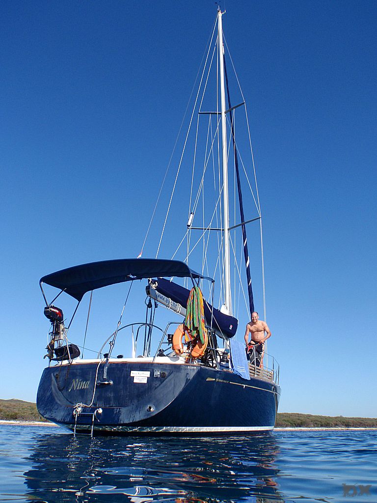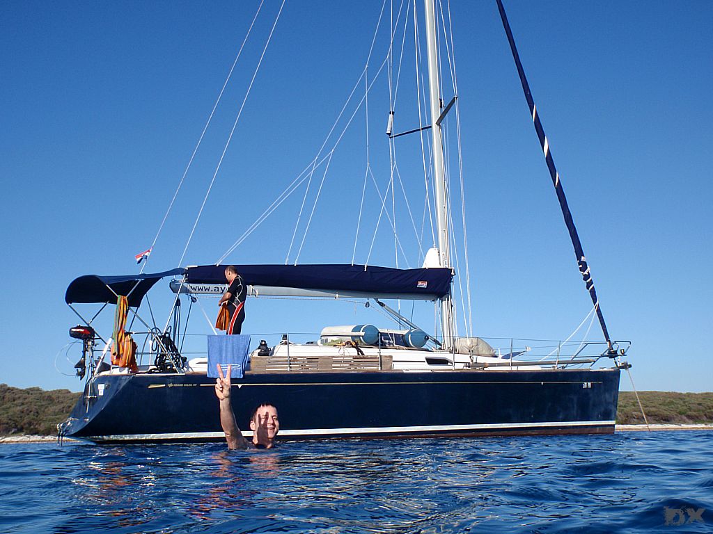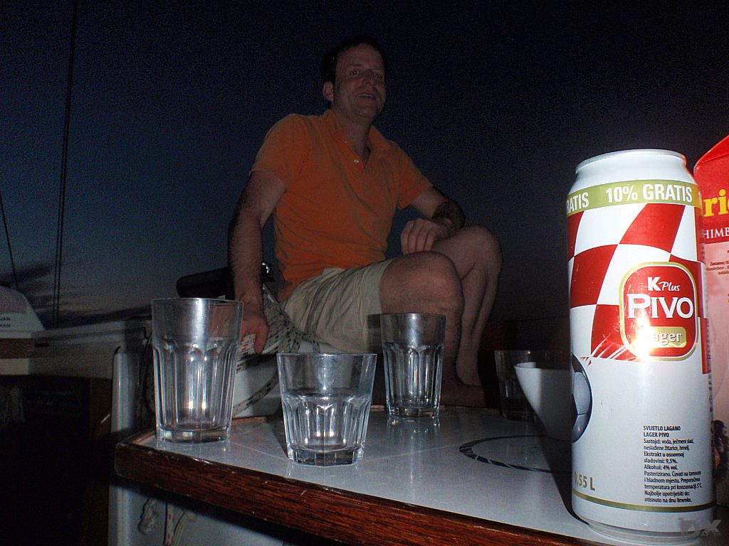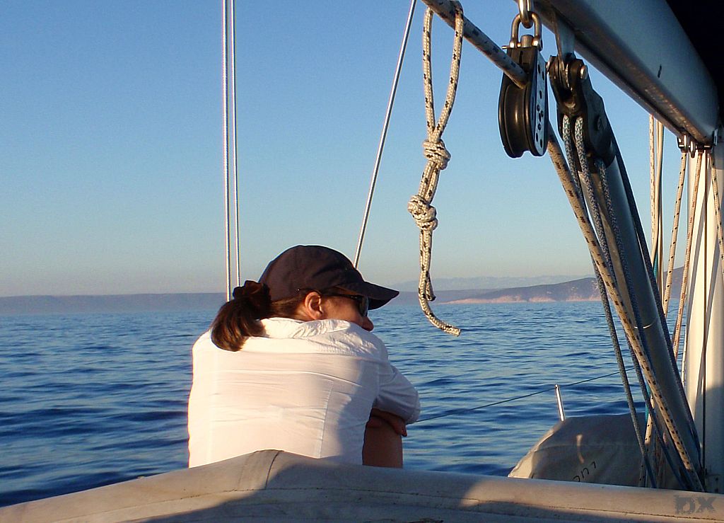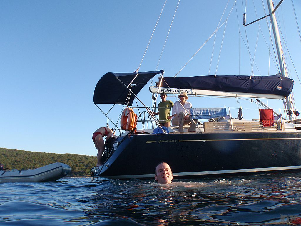 Die Temperatur in Kroatien war erst mal erschlagend. Knapp 35°C. Kaum ein Windhauch. Schnell auf’s Boot, ablegen und los. Ablegen, nun ja. Der Motor lief zwar, aber ohne Gang eingelegt. Mit dem Ablegemanöver haben wir erst mal Aufsehen erregt. Ebbe war auch noch, so dass wir in der Hafenausfahrt mit 0 cam unter dem Kiel rausgerutscht sind. Ein frisches, kühles Bier tut da dann auch gut. Im freien Wasser den Spinnaker gesetzt und mit 5 Knoten Fahrt einen langen Schlag von 25 sm nach Unije, einer kleinen Insel in der Kvarner Bucht. Wir liegen alleine vor Anker. Windstille. Schwimmen. Sonnenuntergang. Herrlich.