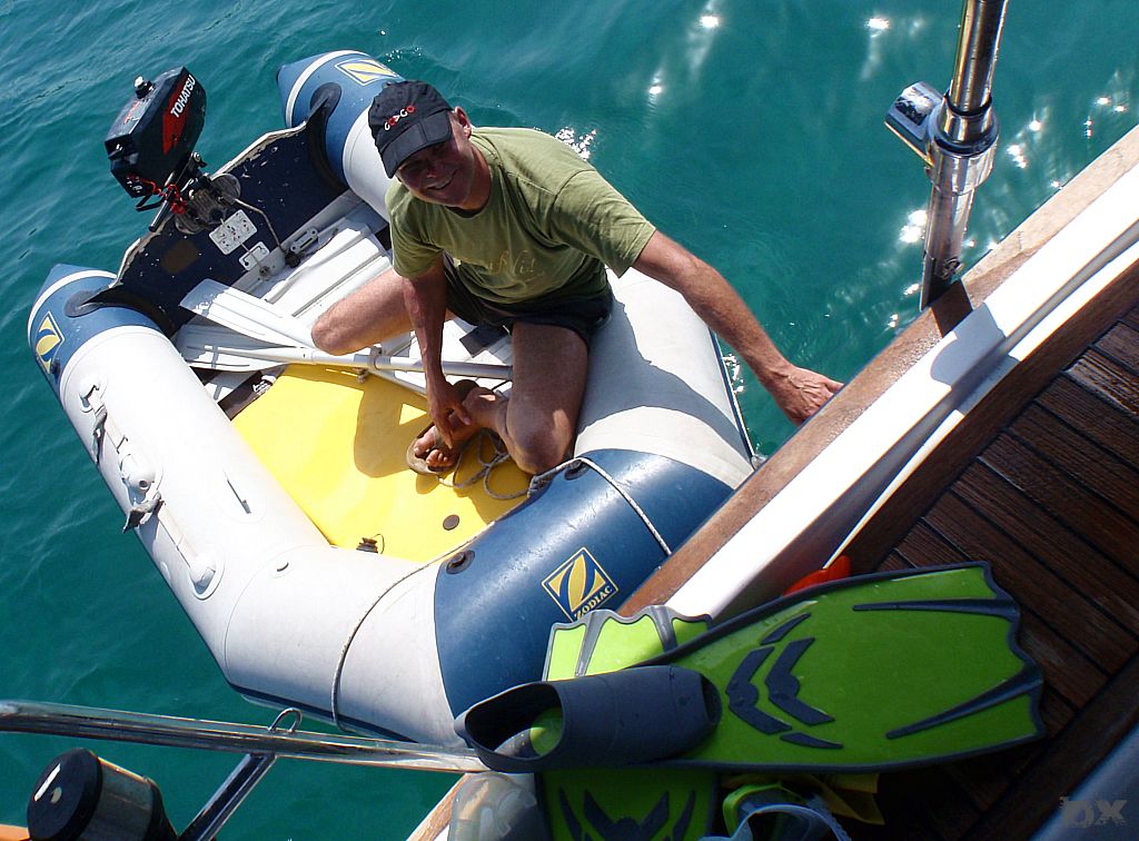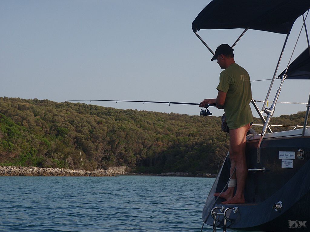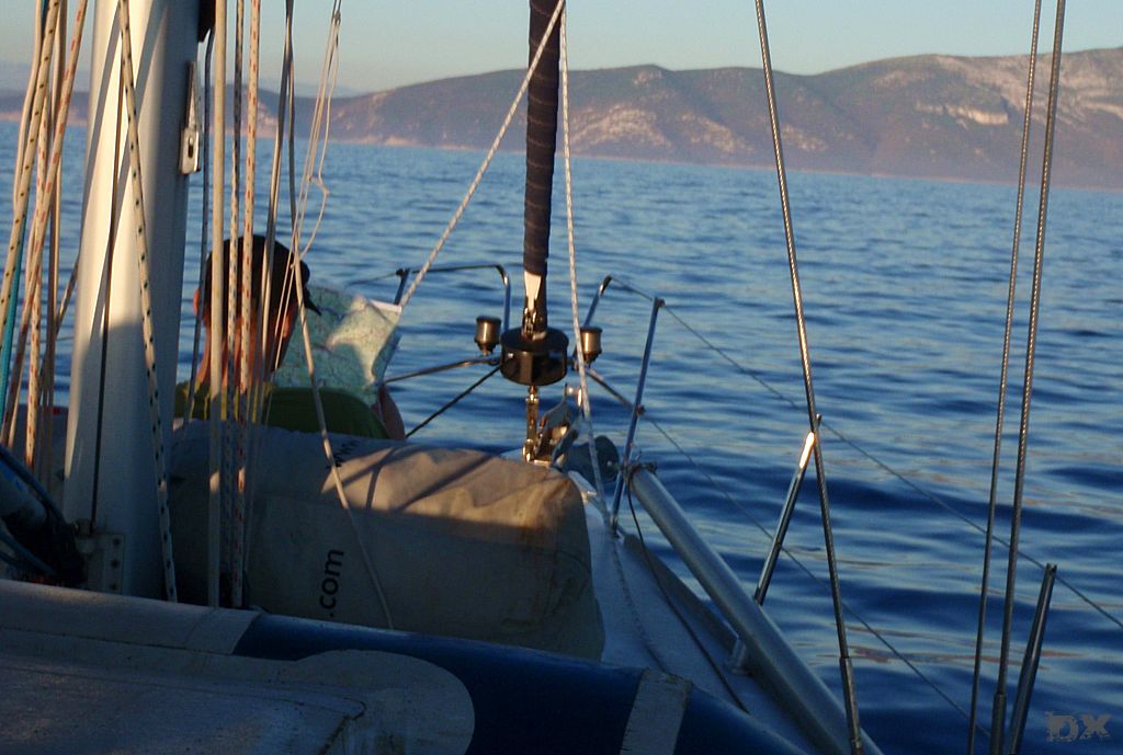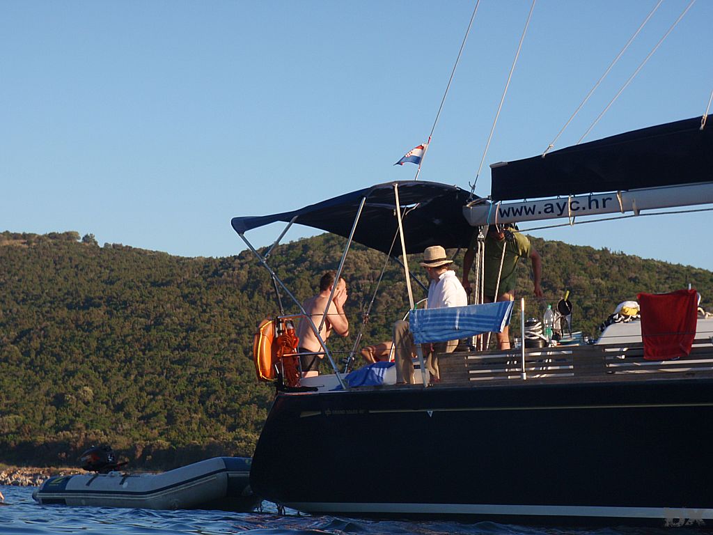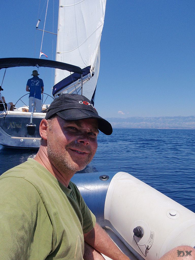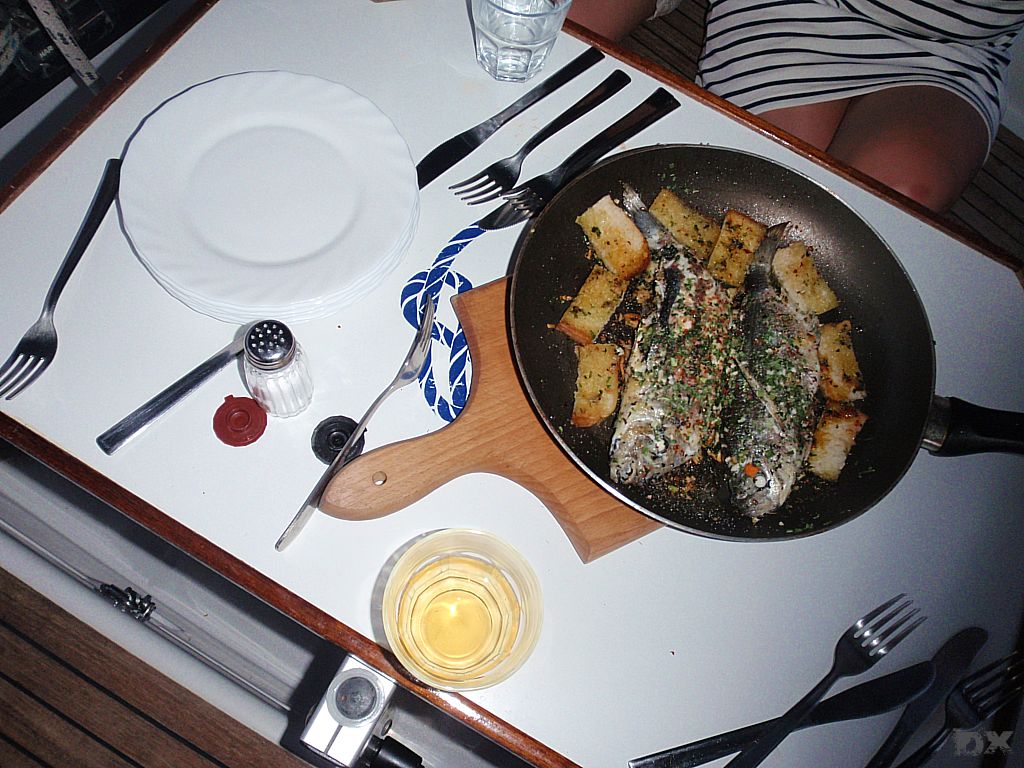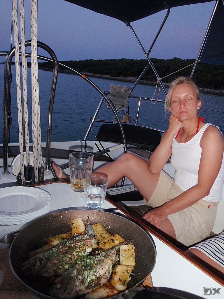 Von Rab unter Motor an die Südspitze von Cres. Die Windvorhersage für heute ist 0 Knoten. Für morgen soll es auf der Westseite von Cress etwas Wind geben. Eine kleine Bucht wollen wir anlaufen. Von weitem schon sehen wir das Partyboot von Rab. Kene Diskussion, Ruder nach Steuerboard und abbiegen in eine andere Bucht. Wieder ein super Abend. Ingo geht mit dem Dingi auf Entdeckungstour. Der Rest der Crew schnorchelt oder liegt relaxed in der Sonne. Stefan ist am fischen. Fisch! Wir haben einen. Wow. Und kurze Zeit später noch einen. Die Pläne für’s Abendessen werden kurzfristig um Fisch erweitert.