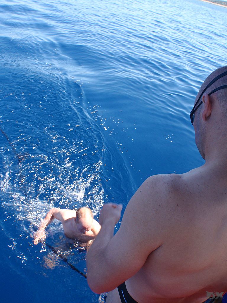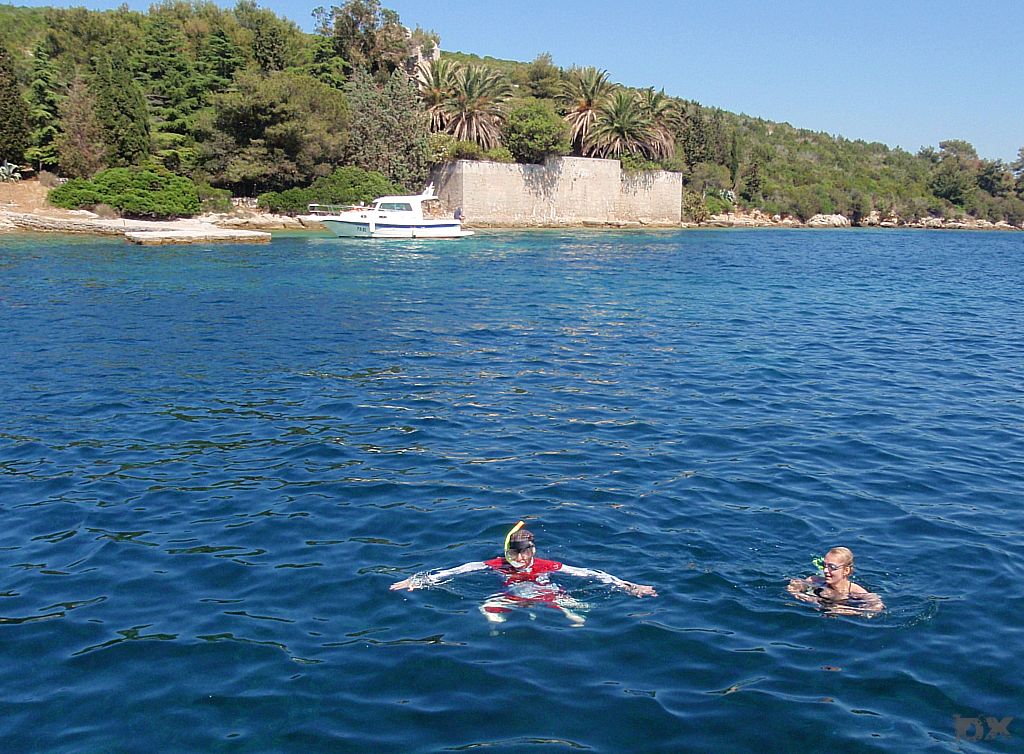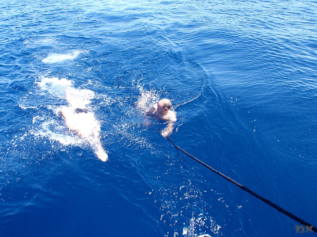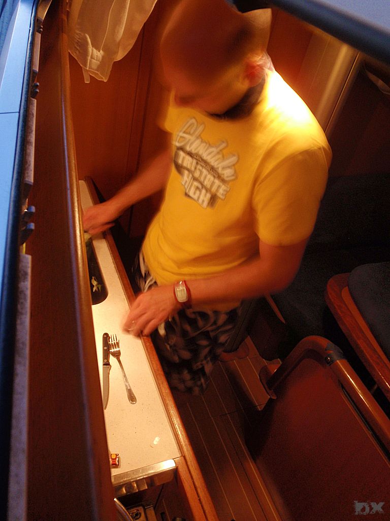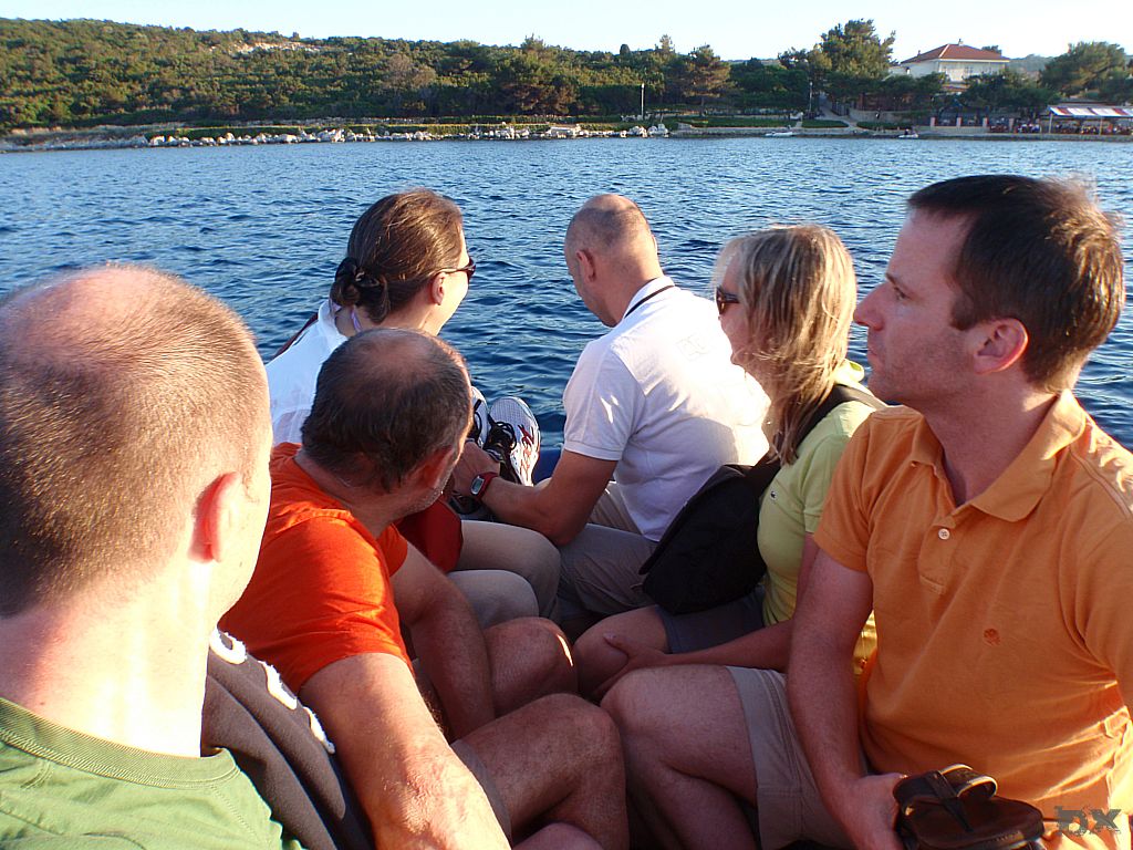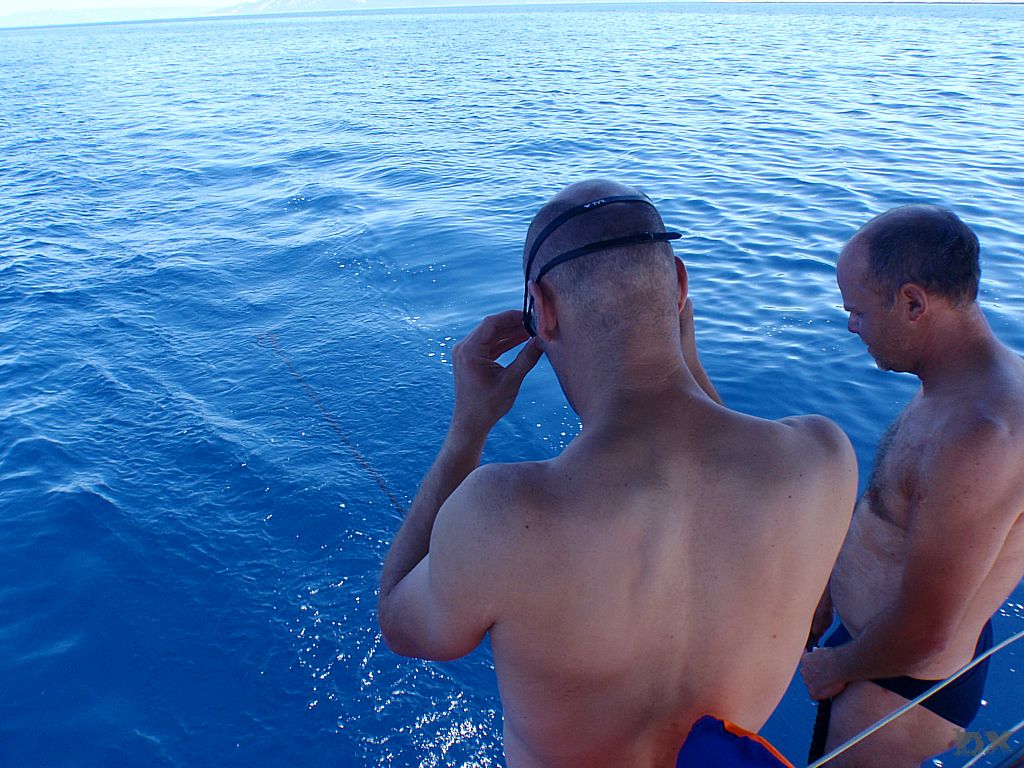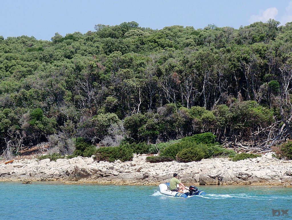 Von Ilovik weiter zur „Frühstücksinsel“. Vor dem klitze kleines Inselchen, Morovnik, an der Nordspitze von Olib ankern wir. Ingo hatte noch frische Semmeln in Ilovik besorgt. Kaffee, Nutella, Wurst und Käse. Frühstück DeLuxe. Wir wollen weiter nach Rab. Der drehende Wind macht uns einen Strich durch die Planung. Kursänderung, fast wieder in Richtung Ilovik. Delphine Steuerboard voraus. Wow. Touristenprogramm. Wir finden eine kleine Bucht bei der Insel Male Orjule. Der felsige Grund ist schlecht zum ankern. Das Wetter ist stabil, kein Sturm in Sicht und wir entschließen uns zu bleiben. Schnorcheln. Spghetti zum Dinner. Chillen. Viel Plankton hat es, knistert an der Bordwand. Wie Million kleiner Nager die probieren das Boot zu fressen. Bei Bewegung im Wasser leuchtet das Plankton wie Leuchtwürmchen. Schwimmen in dieser Planktonwolke ist spanneden. Jeder Schwimmzug verursacht tausende kleiner Lichtblitze. Ein kurioses Erlebnis.