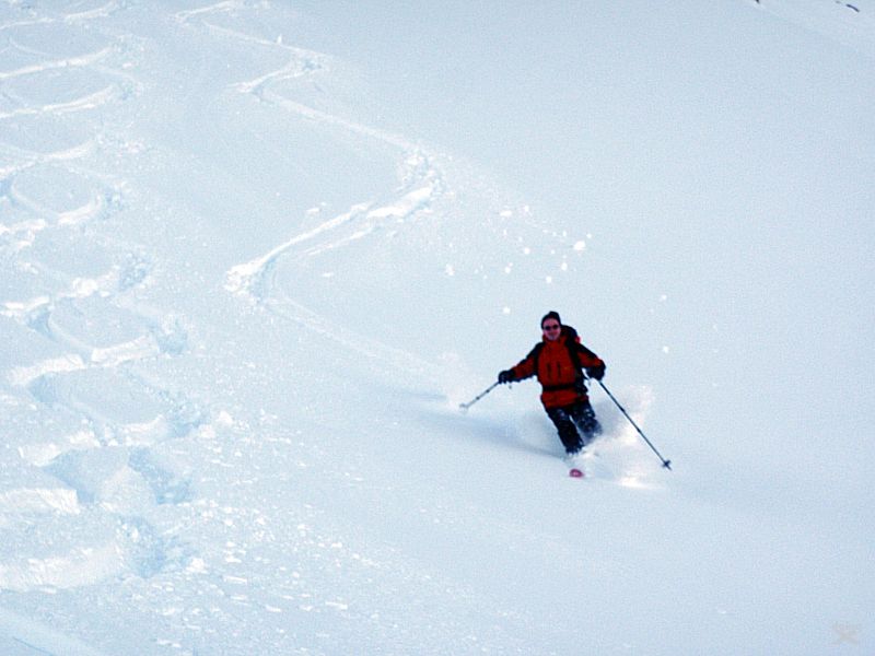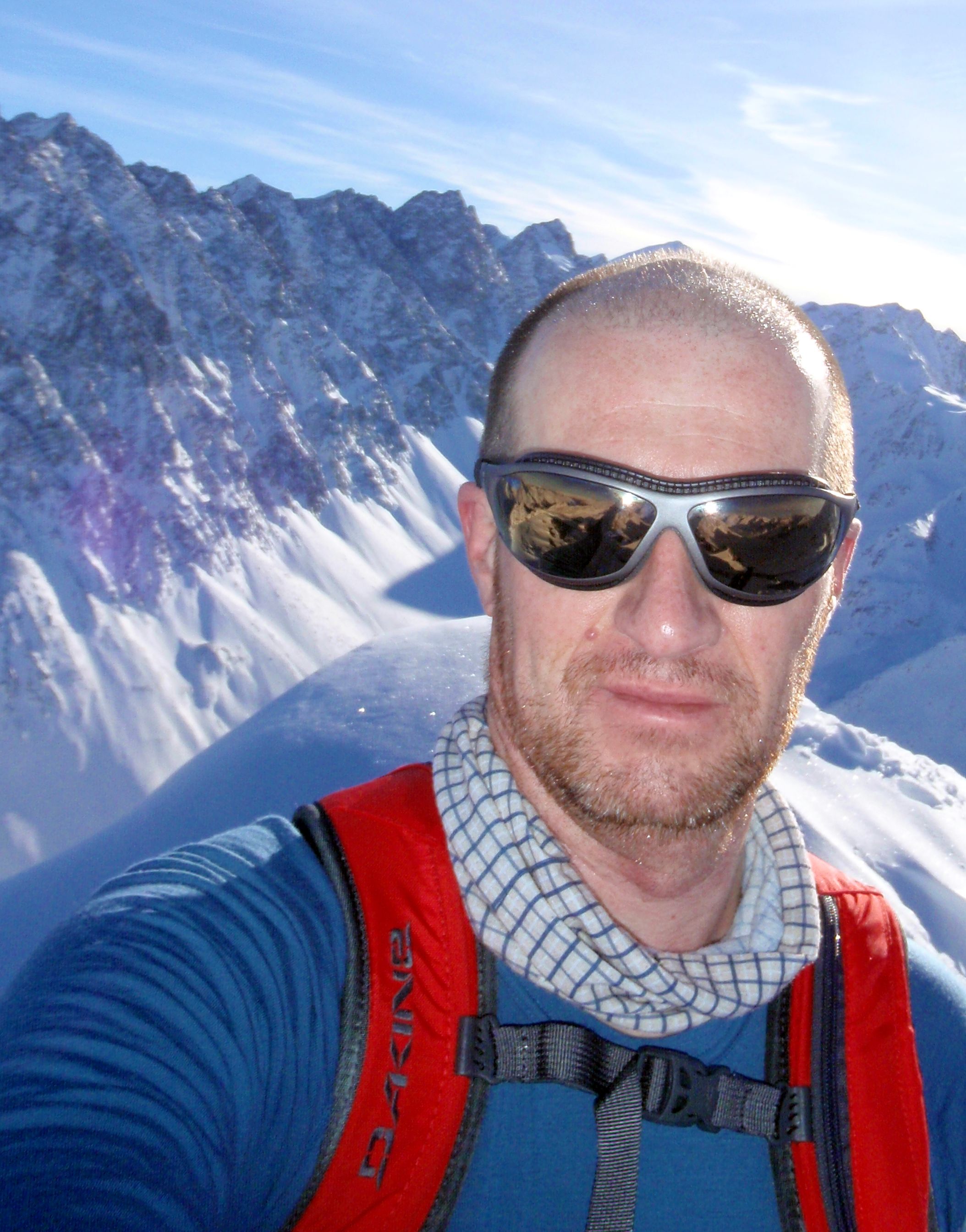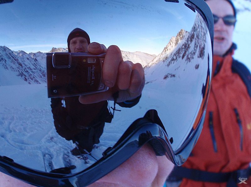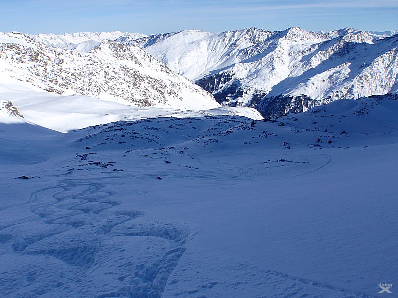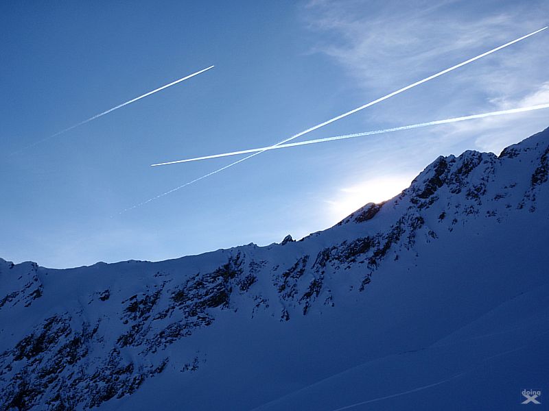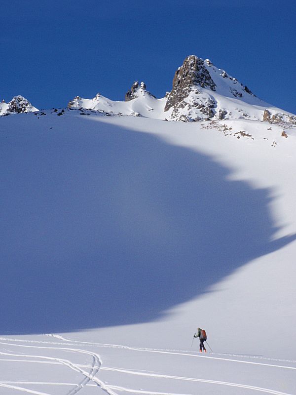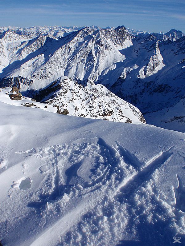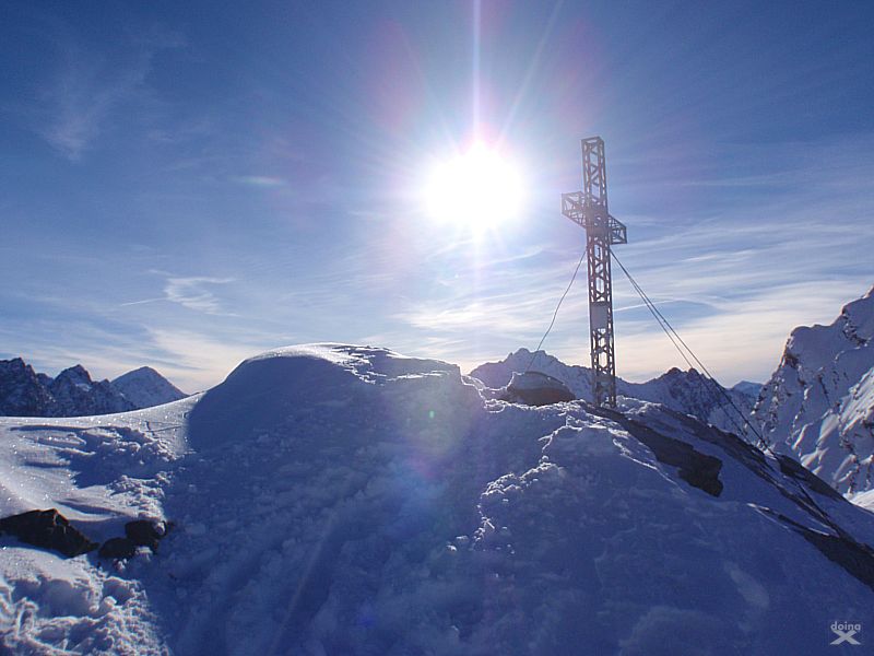 Bei wenig Schneet kommt man mit den Ski nicht weit zum Gipfel, auf ca. 2850m ist dann auchschon das Skidepot. Durch steiles, felsiges Gelände dann die restlichen 100-150 Höhenmeter zum Gipfel. Dünne Luft. Eisig, felsig, rutschig. Zwei Schritte vor, einer zürück. Schnaufen. Der Puls rennt. Es braucht eine Weile bis zum Gipfelkreuz auf 3002m. Der Ausblick ist Klasse. Tiefe Täler und Gipfel bis zum Horizont.