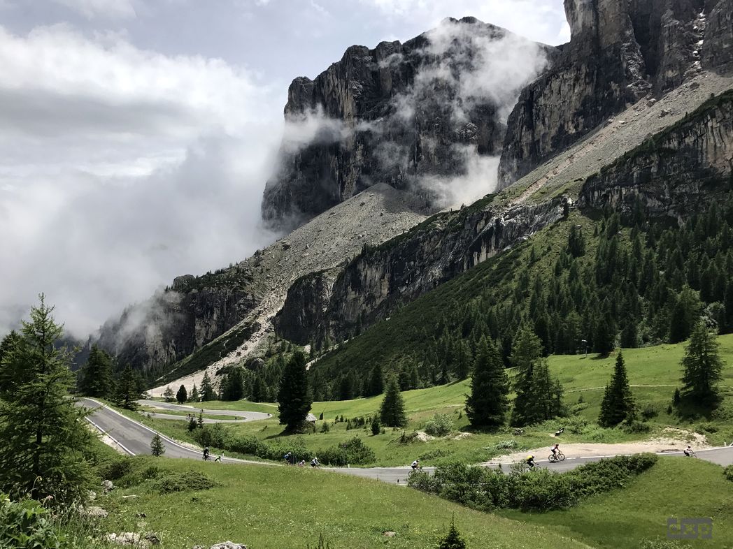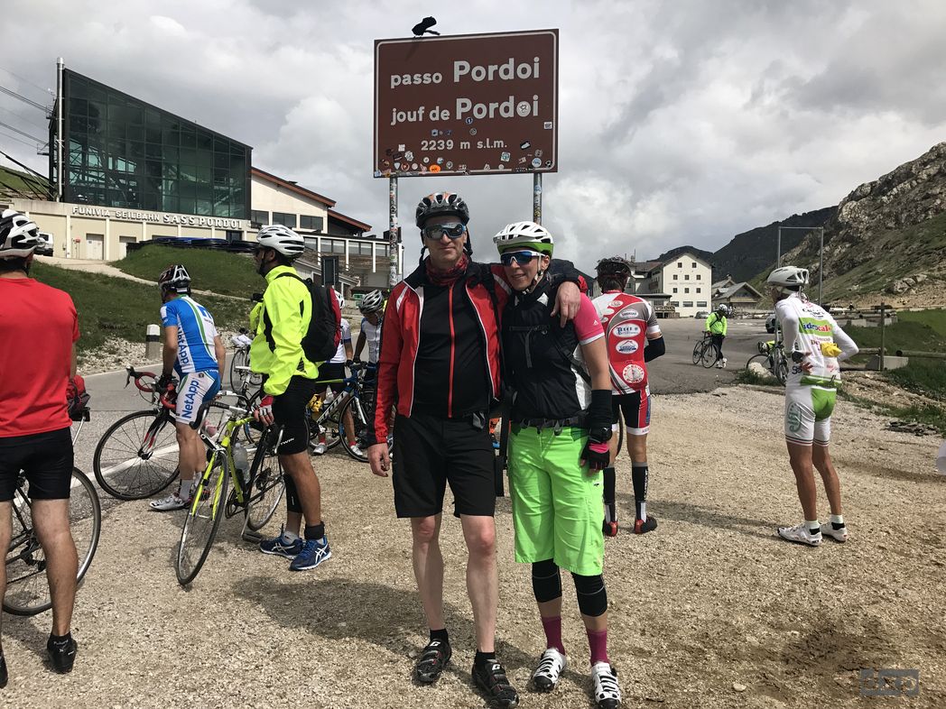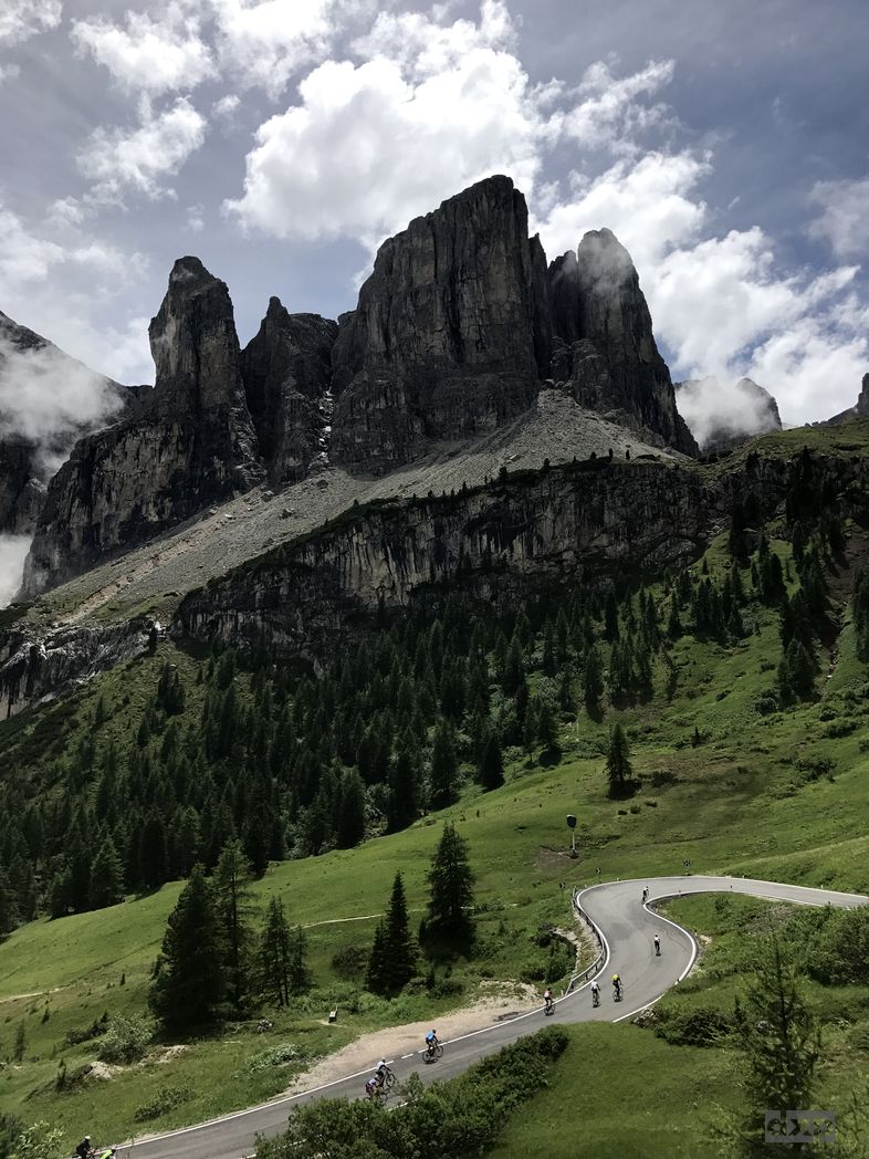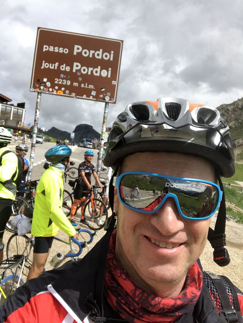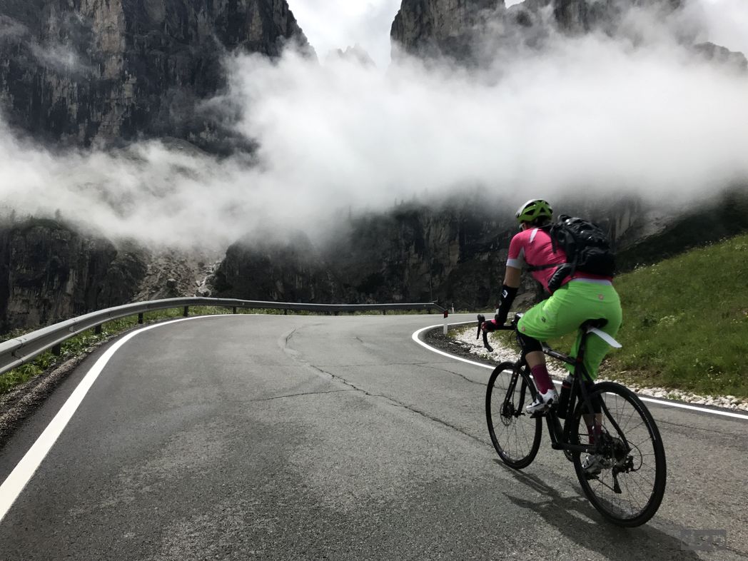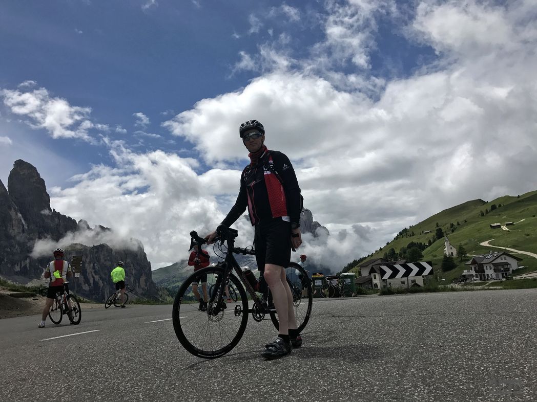 Mit dem Rad um die Sella am „Sella Bike Day“. Auf gesperrten Straßem über 4 Pässe und 1600 Höhenmeter führt uns die Runde. Leider kühl und nass am Morgen. Statt um 08:30 kommen wir erst kurz nach 11:00 los, al endlich der Regen nach lässt. Wir machen uns auf den Weg. Über den Passo Campolongo (1850m), weiter zum Passo Gardena (2110m), dem Passo Sella (2200m) und dann dem Passo Pordoi (2230m). Dort noch ein Finisher Bierchen und wir rollen um 16:30 den letzten Pass runter nach Arabba.