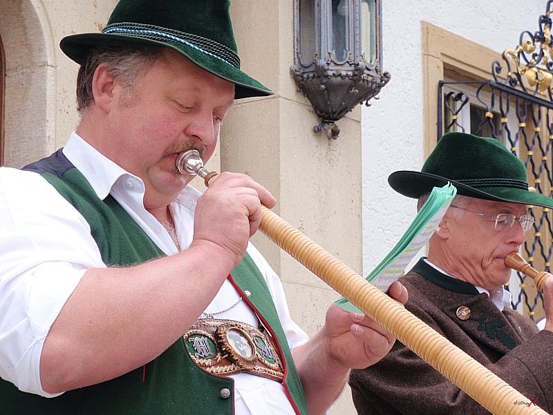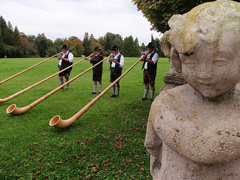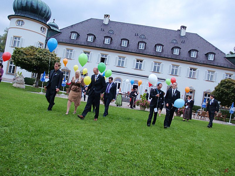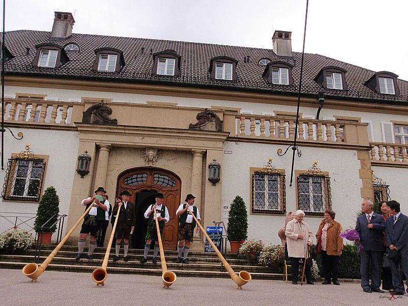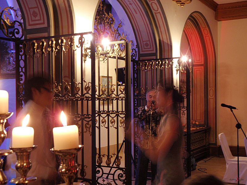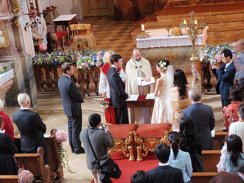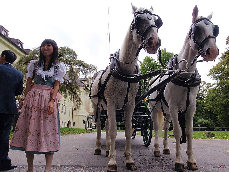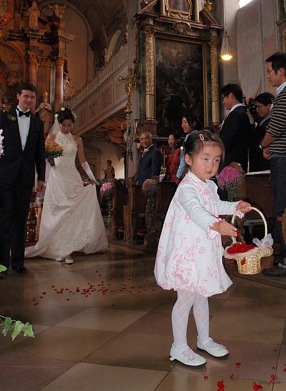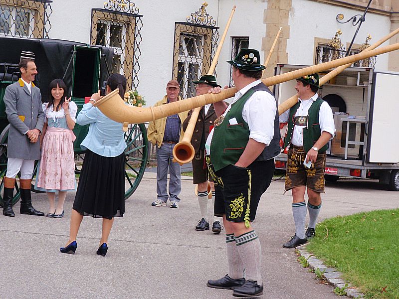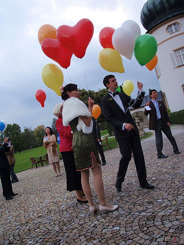 | Dank Übersetzer konnten wir auch dem Brautvater bei den Reden folgen. Der Wunsch für die Tochter doch bald ein Einzelkind (in China gibt es ja nach wie vor die Einkind-Politik) zu bekommen und dass der Sohn erfolgreich im Beruf sein soll macht schon den Unterschied der Kulturen bewusst, passt aber wunderbar in diesen modernen, multikulturellen Freundeskreis. Die Kirchliche Trauung im Kloster Bernried und der Empfang auf Schloß Hohenried waren schon ein beeindruckendes Erlebnis. Das Brautpaar in der Kutsche und die Alphornbläser rundeten das Bild dieser internationalen Hochzeit ab. Weiter so und viel Spass und Freude für die Zukunft wünsche ich dem Paar! |