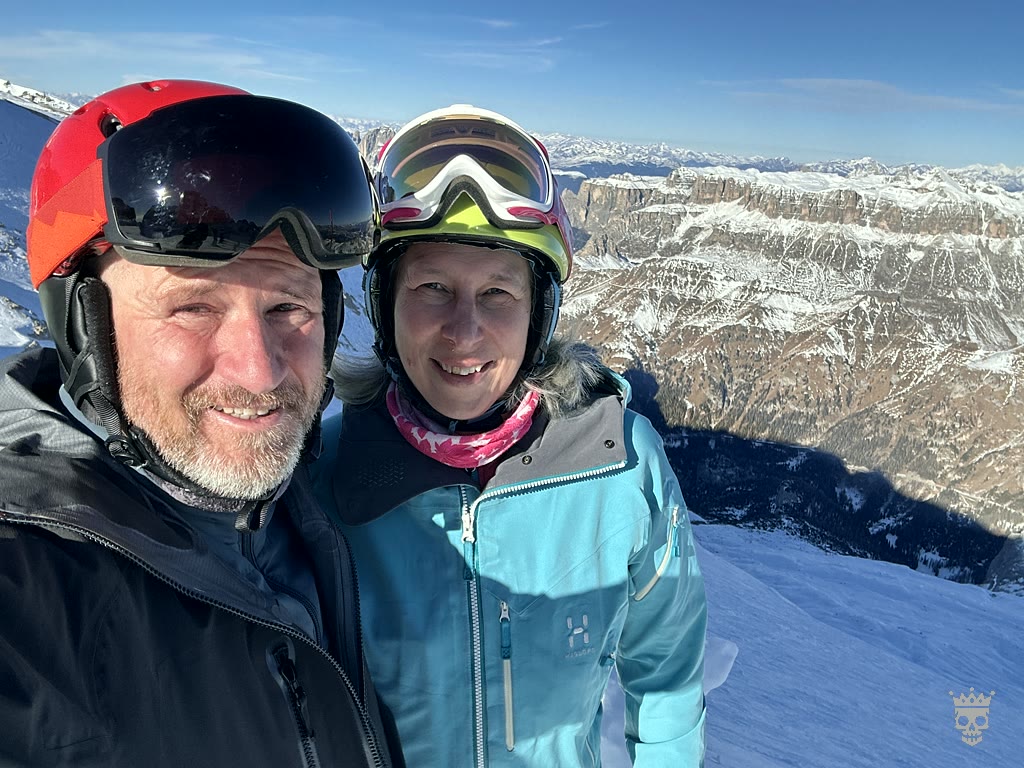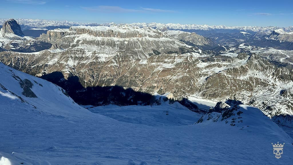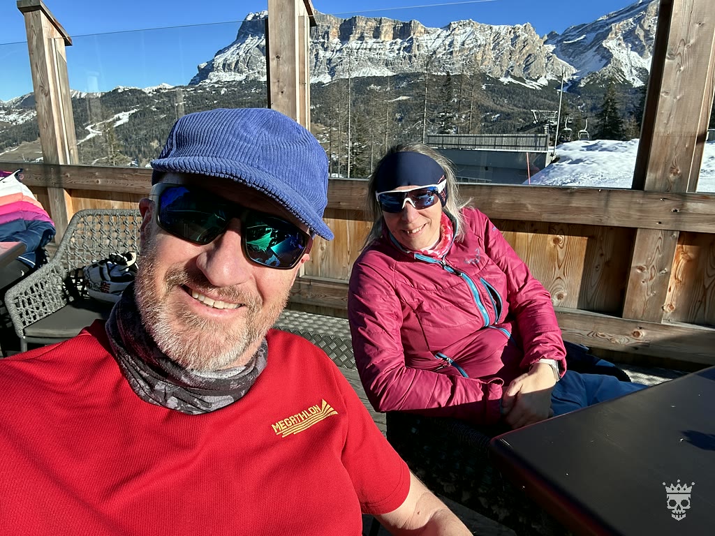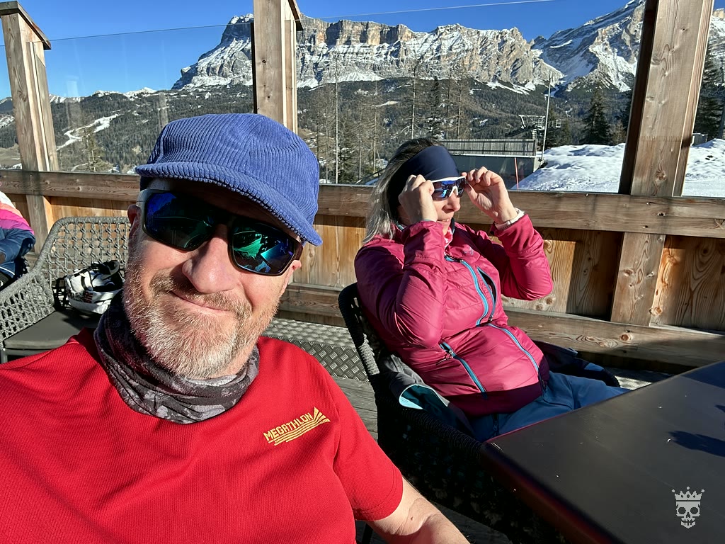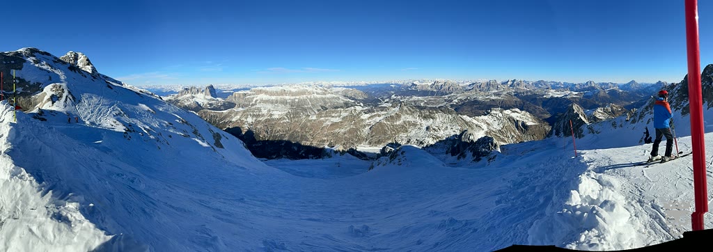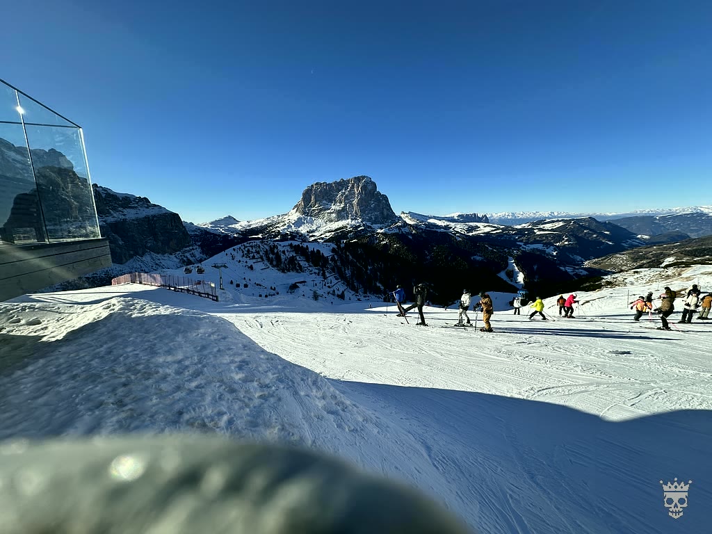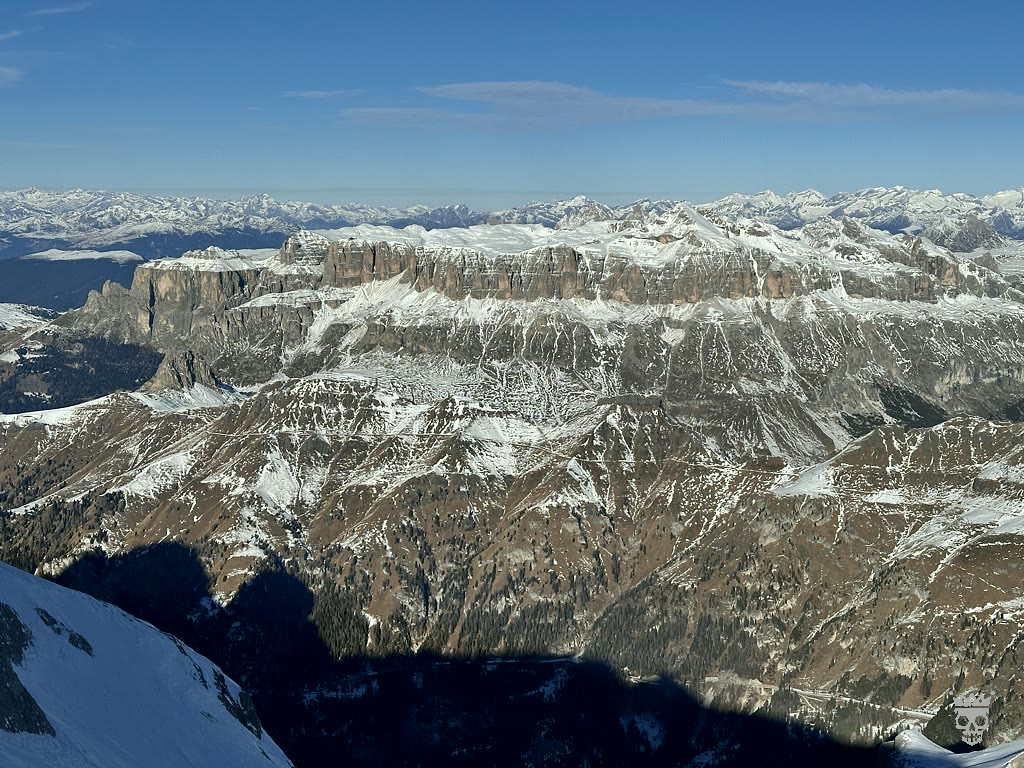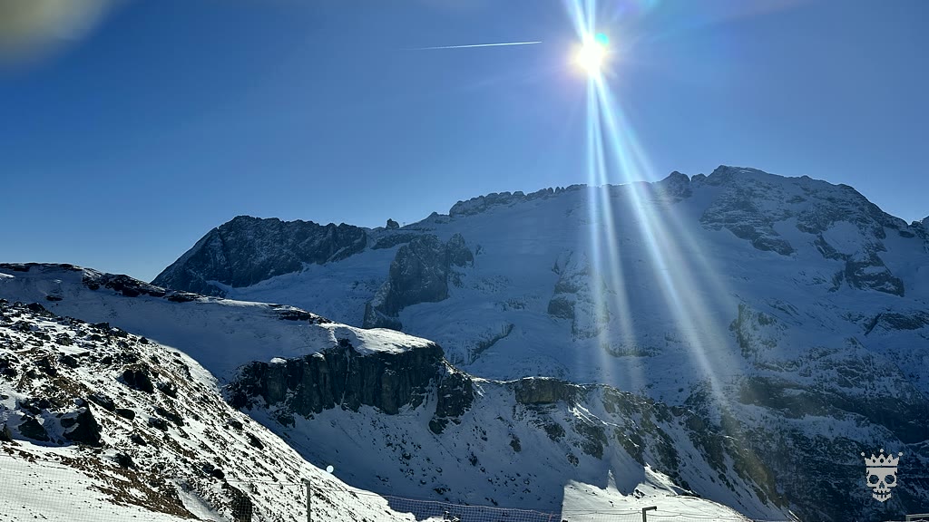 Am Montag zur Marmolada. Gigantische Aussicht in die Dolomite. Traumlandschaft. Die Abgfahrt ist lang, anstrengend und schön. Nochmal fahren wir hoch. Zurück müssen wir den Lift über den nächsten Pass nehmen. Die Abfahrt ist gesperrt, wir prepariert. Die Skifahrer drängeln sich am Lift. Wir gehen erst mal auf ein Bierchen in die Hütte.