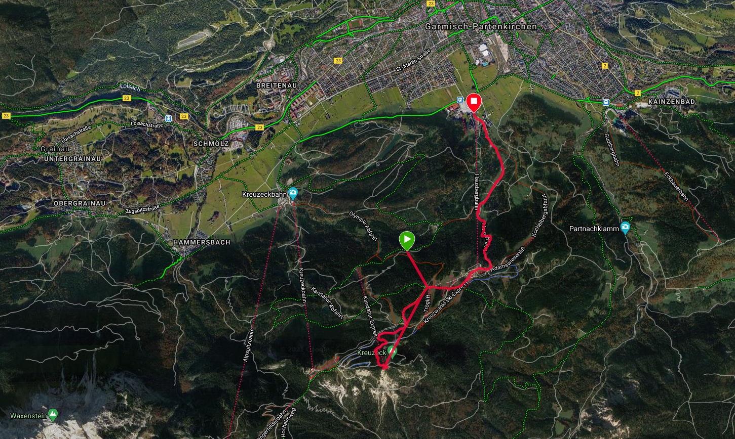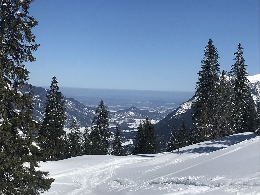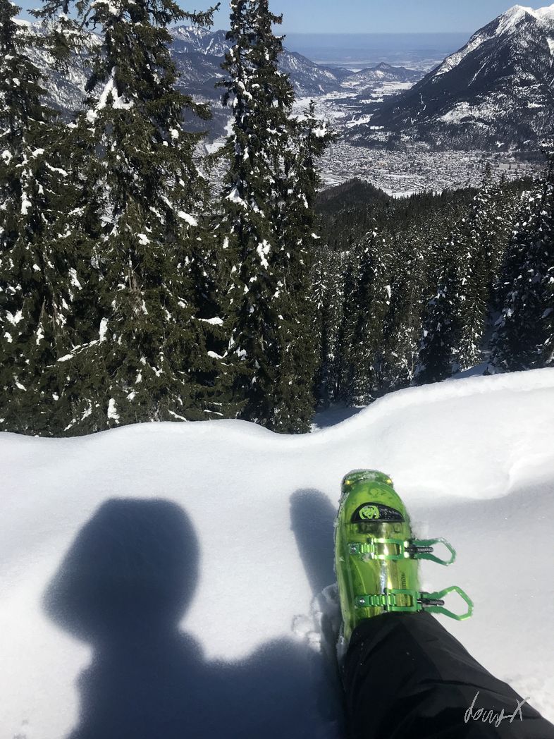 Von Garmisch auf das Kreuzeck (1719m). Die Lifte haben ja geschlossen, so ist genug Platz am Parkplatz. Über die Skipisten geht es dann gemütlich hinauf zum Kreuzjoch und weiter zum Kreuzeck Gipfel. Die Sonne scheint, es ist warm. Viel zu warm bin ich angezogen für den tag. Ich suche mir die Schattenseiten beim Aufstieg. Im Wald noch frischer Powder für die Abfahrt. Puh. Anstrengend. Die 900m hinauf haben mich doch etwas Kraft gekostet. Aber schön wars allemal und der Blick über Garmisch ins Voralpenlad ist schon Klasse.