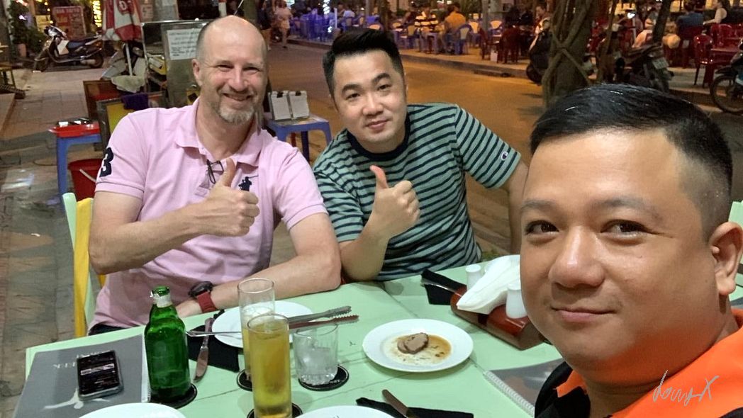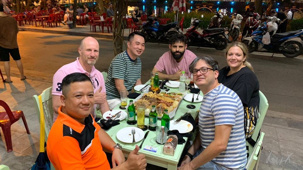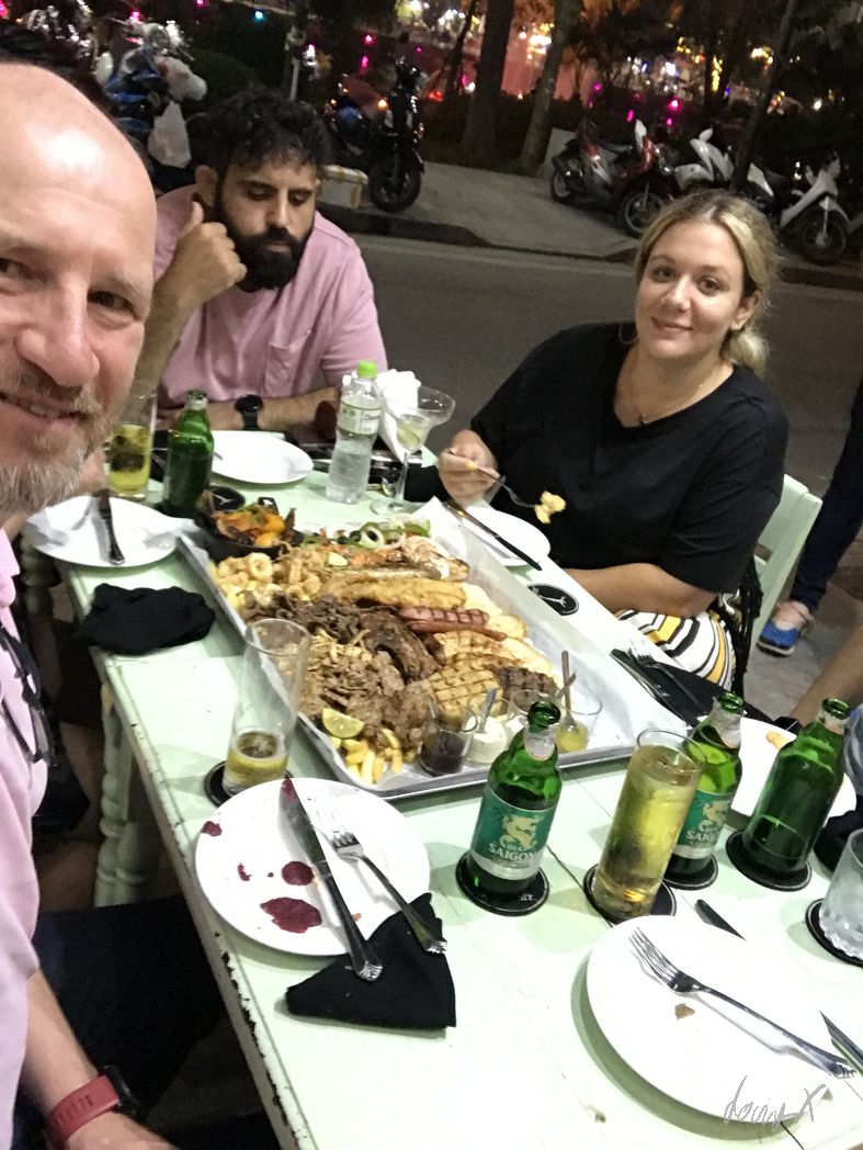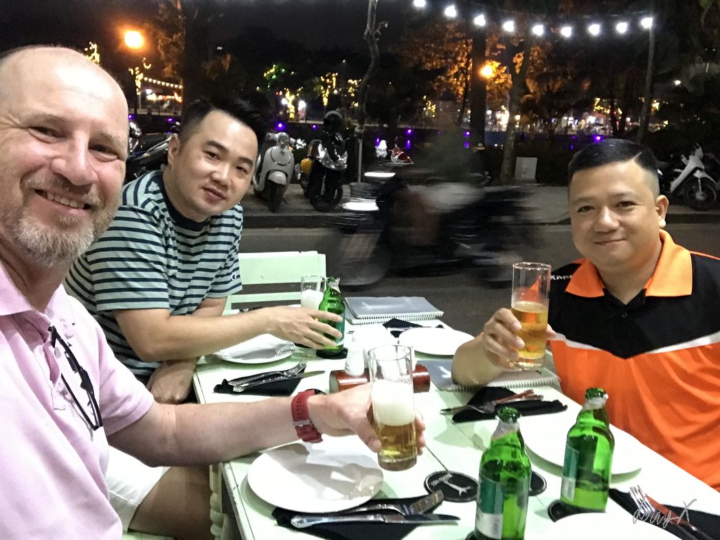 Abends treffen wir uns mit Kunden. Bezoiehungen pflegen beim gemeinsamen Essen. Sehr wichtig in Asien. Beziehungen und vertrauen sind oft wichtiger als Daten und Fakten, wie wir das von Europa kennen. Vinfast, eine – die -vietnamesische Automarke will demnächst elektrische Fahrzeuge auf den Markt bringen. Jung, dynamisch, ambitioniert. Der Chef-Entwickler ist ein Grieche. Vermutlich der Grund, warum wir uns in einem griechischen Restaurant treffen. Nur drei davon gibt es in ganz Vietnam, wird mir vom Chef erklärt. Lecker ist es, aber halt so gar nicht asiatisch. Wir sitzen bis spät, tauschen Ideen aus und überlegen die nächsten Schritte.